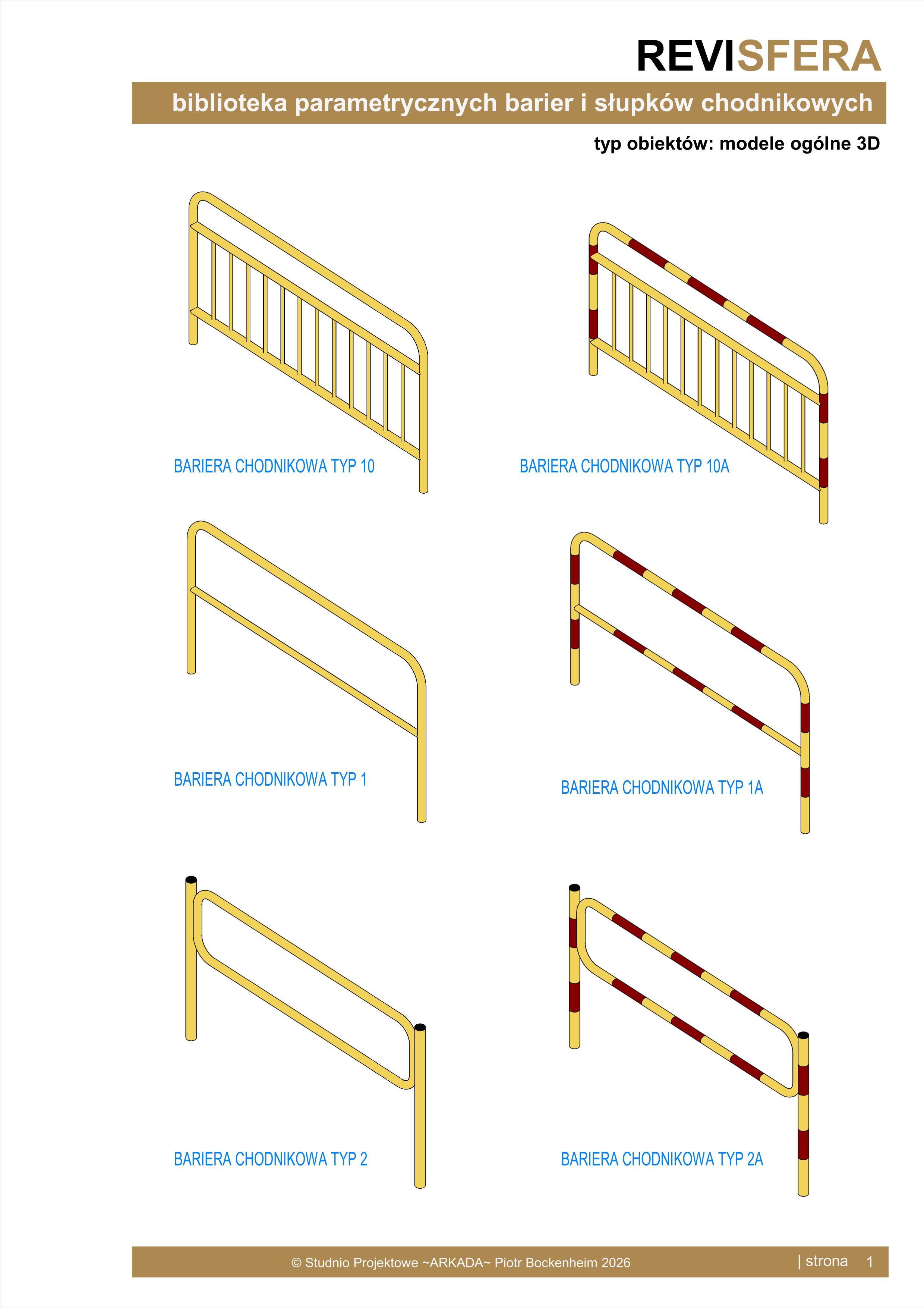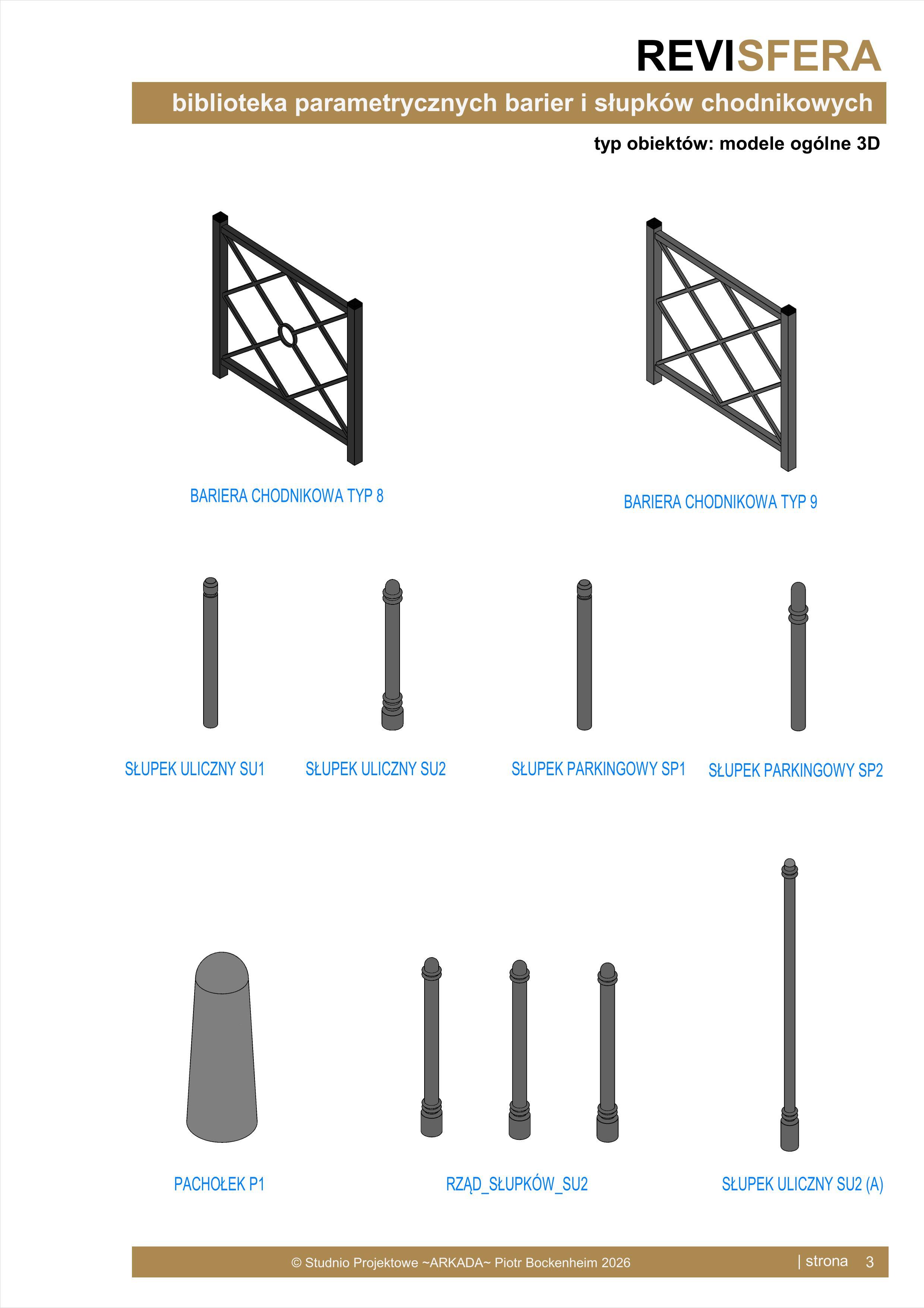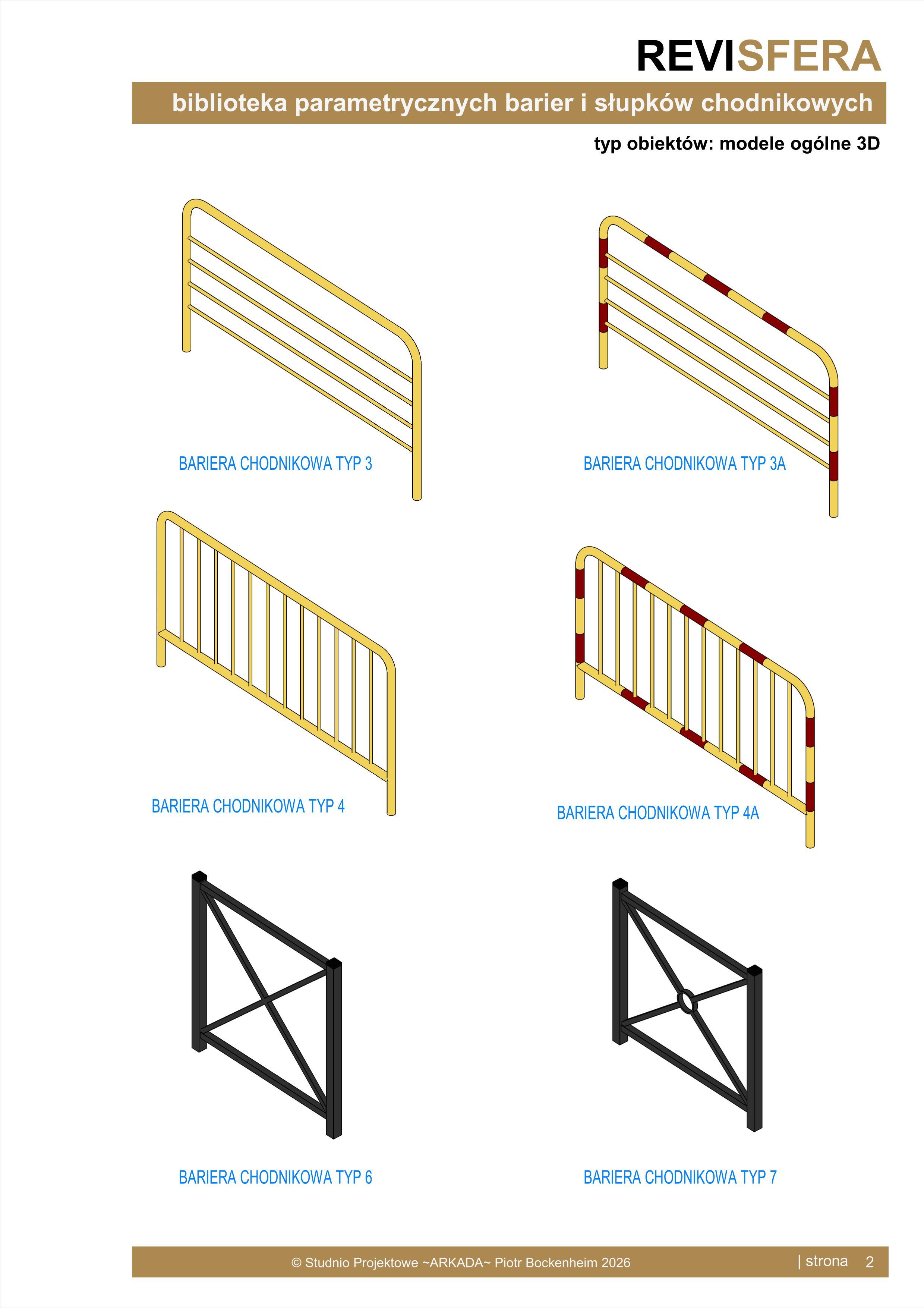 Biblioteka zawiera parametryczne, uniwersalne elementy barier i słupków chodnikowych. Obiekty są w pełni parametryczne, co pozwala na dowolne dopasowanie ich wymiarów oraz materiałów.