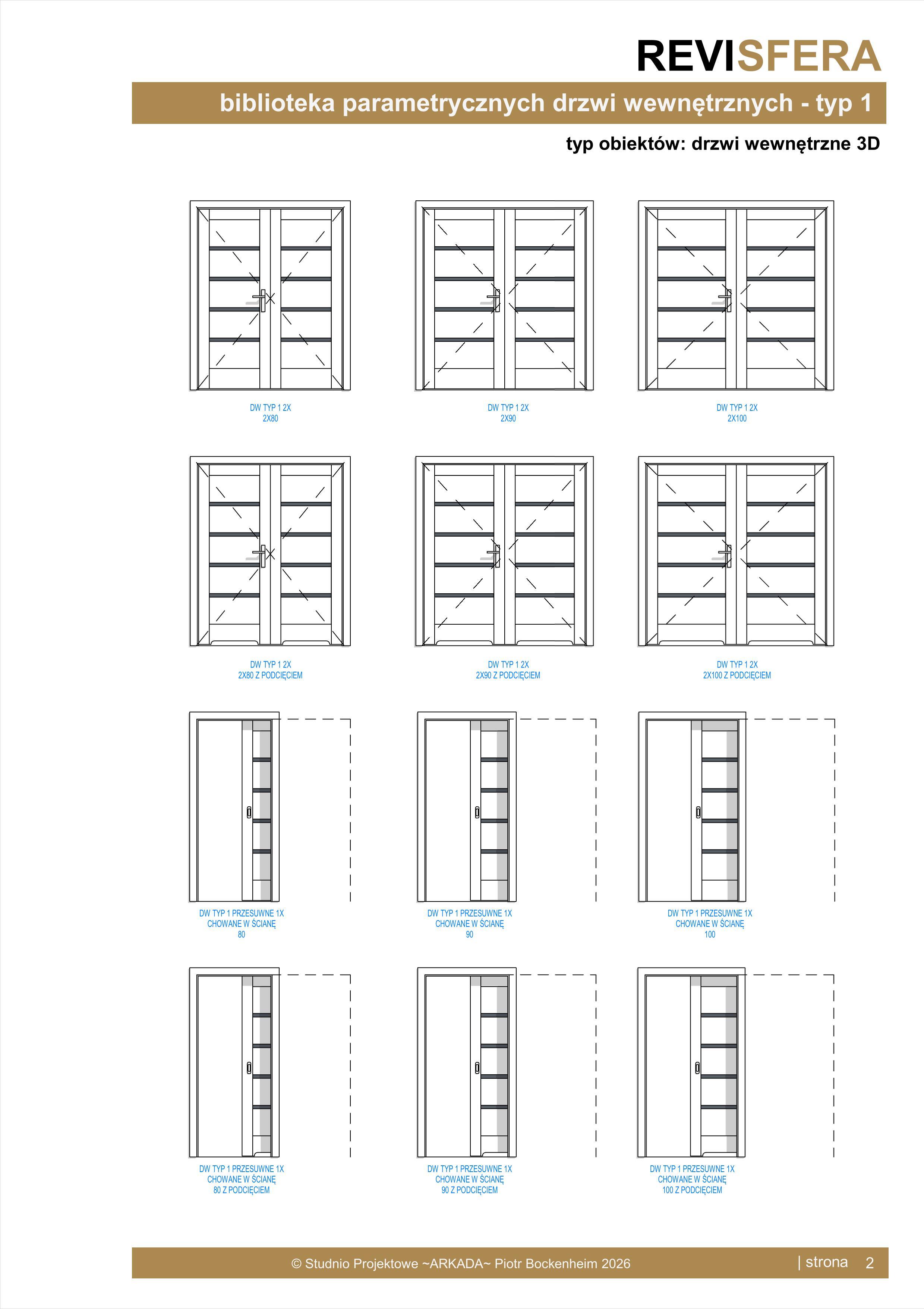 Biblioteka zawiera parametryczne, uniwersalne drzwi wewnętrzne drewnopochodne. Drzwi występują jako jedno- i dwuskrzydłowe, rozwierne oraz przesuwne. Obiekty biblioteczne są w pełni parametryczne - możliwa jest zmiana wszystkich wymiarów. Sposób przygotowania obiektów umożliwia sterowanie widocznością progów, symbolami kierunku otwierania, poziomem uszczegółowienia, itp.