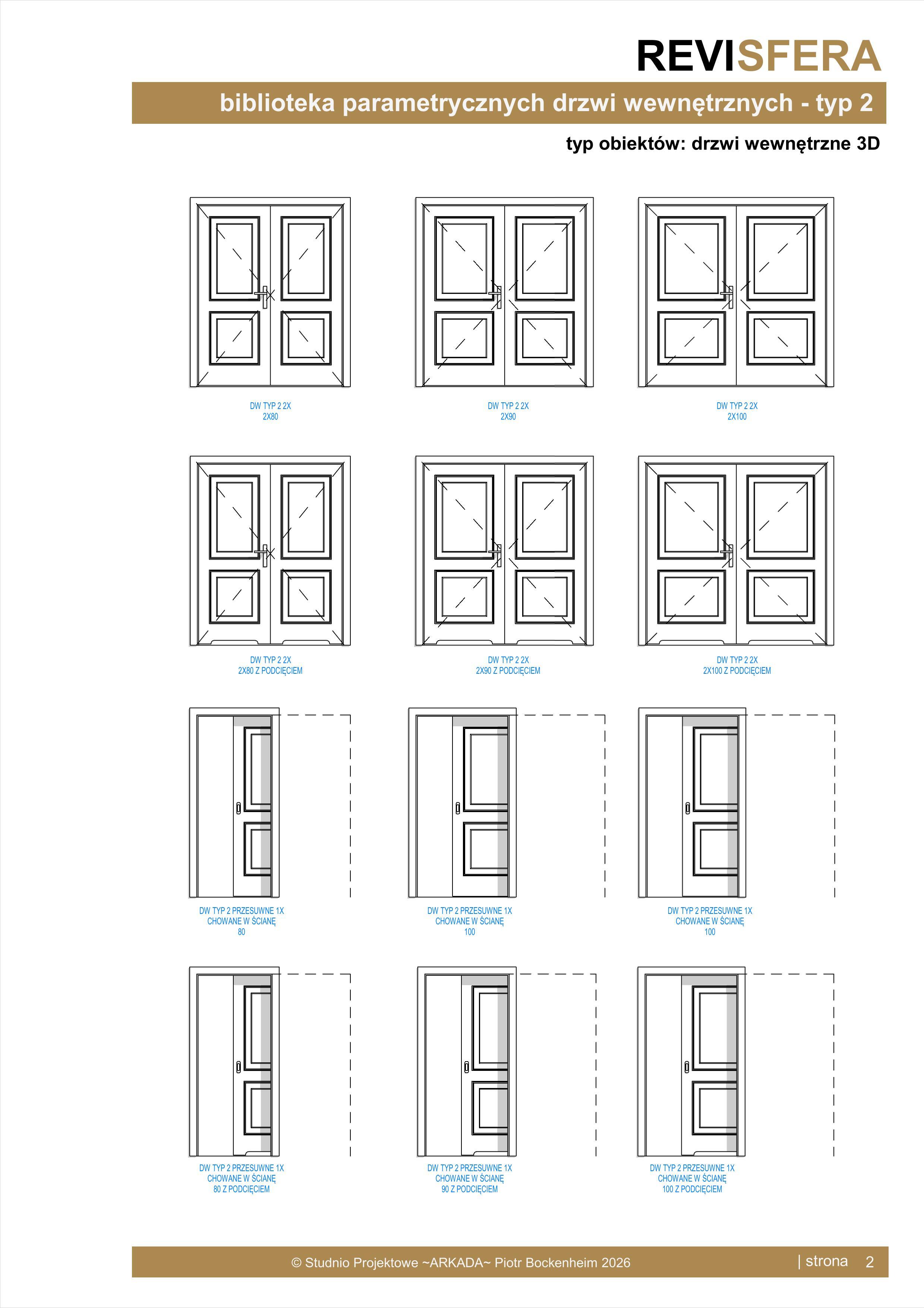 Biblioteka zawiera parametryczne, uniwersalne drzwi wewnętrzne drewnopochodne. Drzwi występują jako jedno- i dwuskrzydłowe, rozwierne oraz przesuwne. Obiekty biblioteczne są w pełni parametryczne - możliwa jest zmiana wszystkich wymiarów. Sposób przygotowania obiektów umożliwia sterowanie widocznością progów,  symbolami kierunku otwierania, itp.