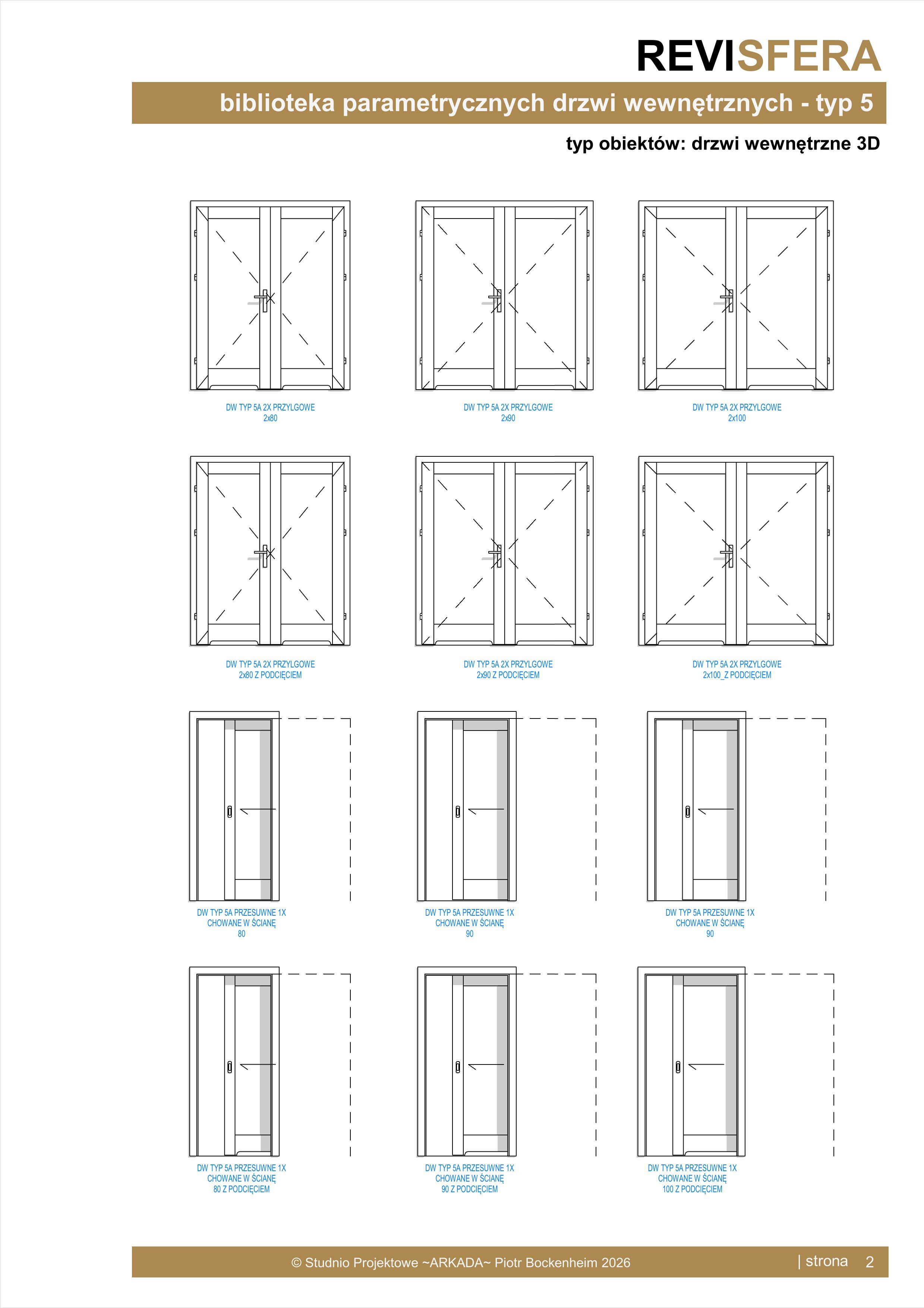 Biblioteka zawiera parametryczne, uniwersalne drzwi wewnętrzne drewnopochodne. Drzwi występują jako jedno- i dwuskrzydłowe, rozwierne oraz przesuwne nakładane oraz chowane w ścianę. Obiekty biblioteczne są w pełni parametryczne - możliwa jest zmiana wszystkich wymiarów. Sposób przygotowania obiektów umożliwia sterowanie widocznością progów,  symbolami kierunku otwierania, poziomem uszczegółowienia, itp.
