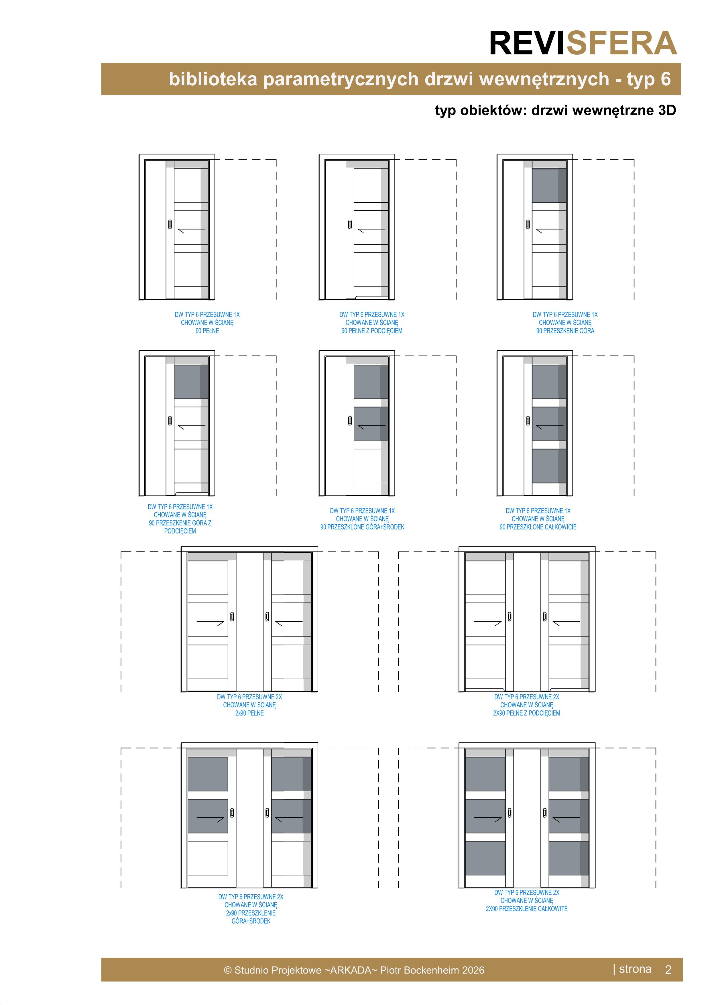 Biblioteka zawiera parametryczne, uniwersalne drzwi wewnętrzne drewnopochodne z ościeżnicami opaskowymi, regulowanymi. Drzwi występują jako jedno- i dwuskrzydłowe, rozwierne oraz przesuwne nakładane oraz chowane w ścianę. Obiekty biblioteczne są w pełni parametryczne - możliwa jest zmiana wszystkich wymiarów. Sposób przygotowania obiektów umożliwia sterowanie widocznością progów, symbolami kierunku otwierania, poziomem uszczegółowienia, itp