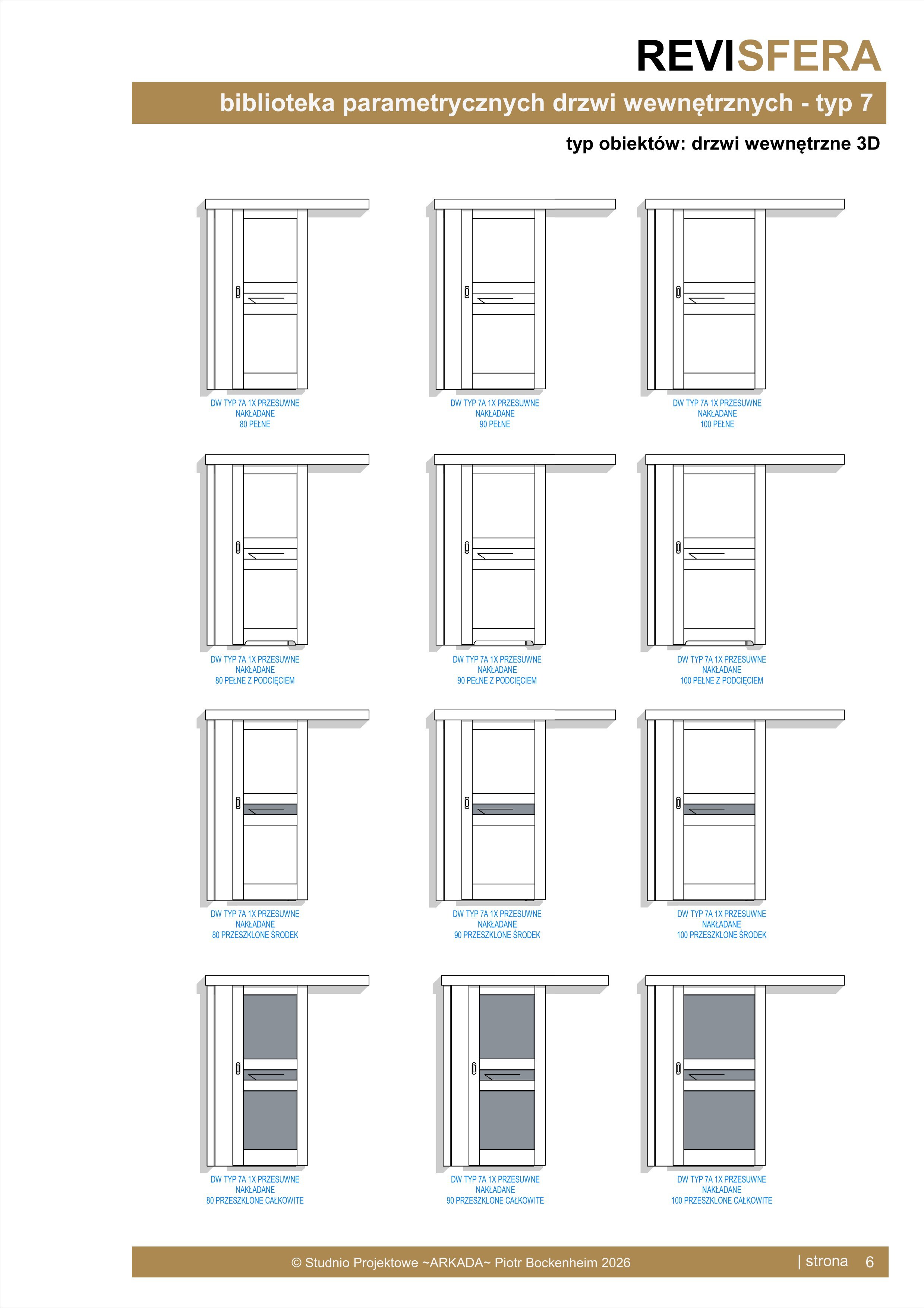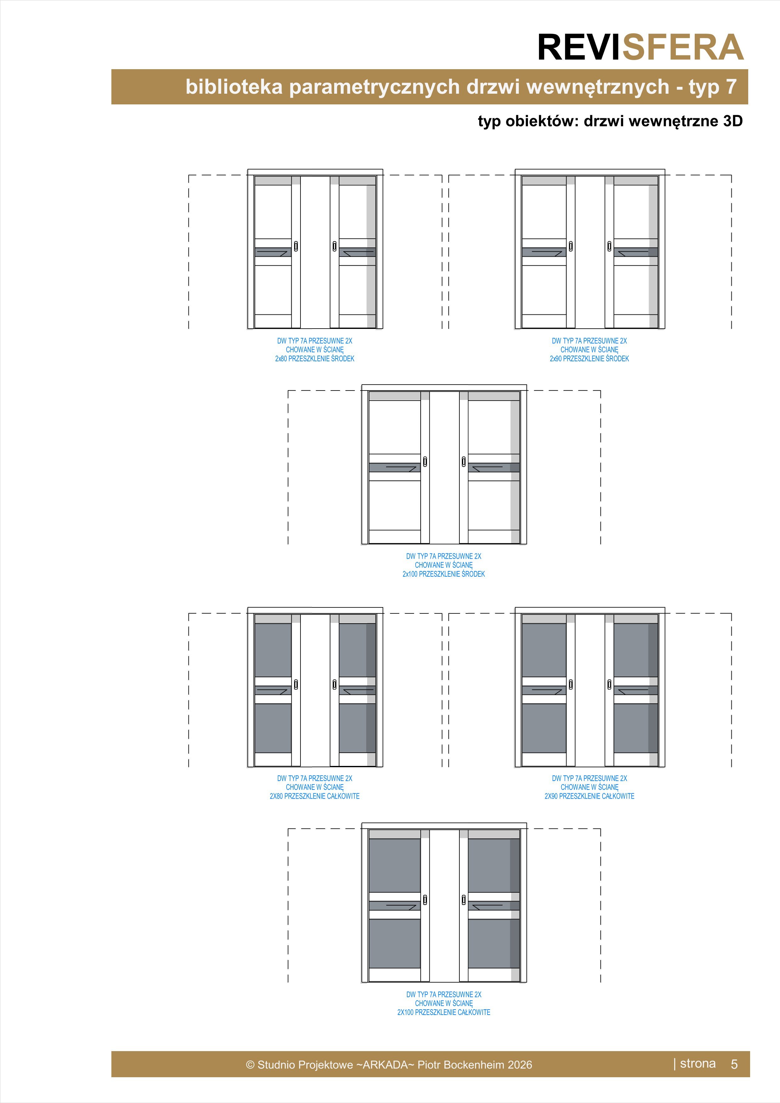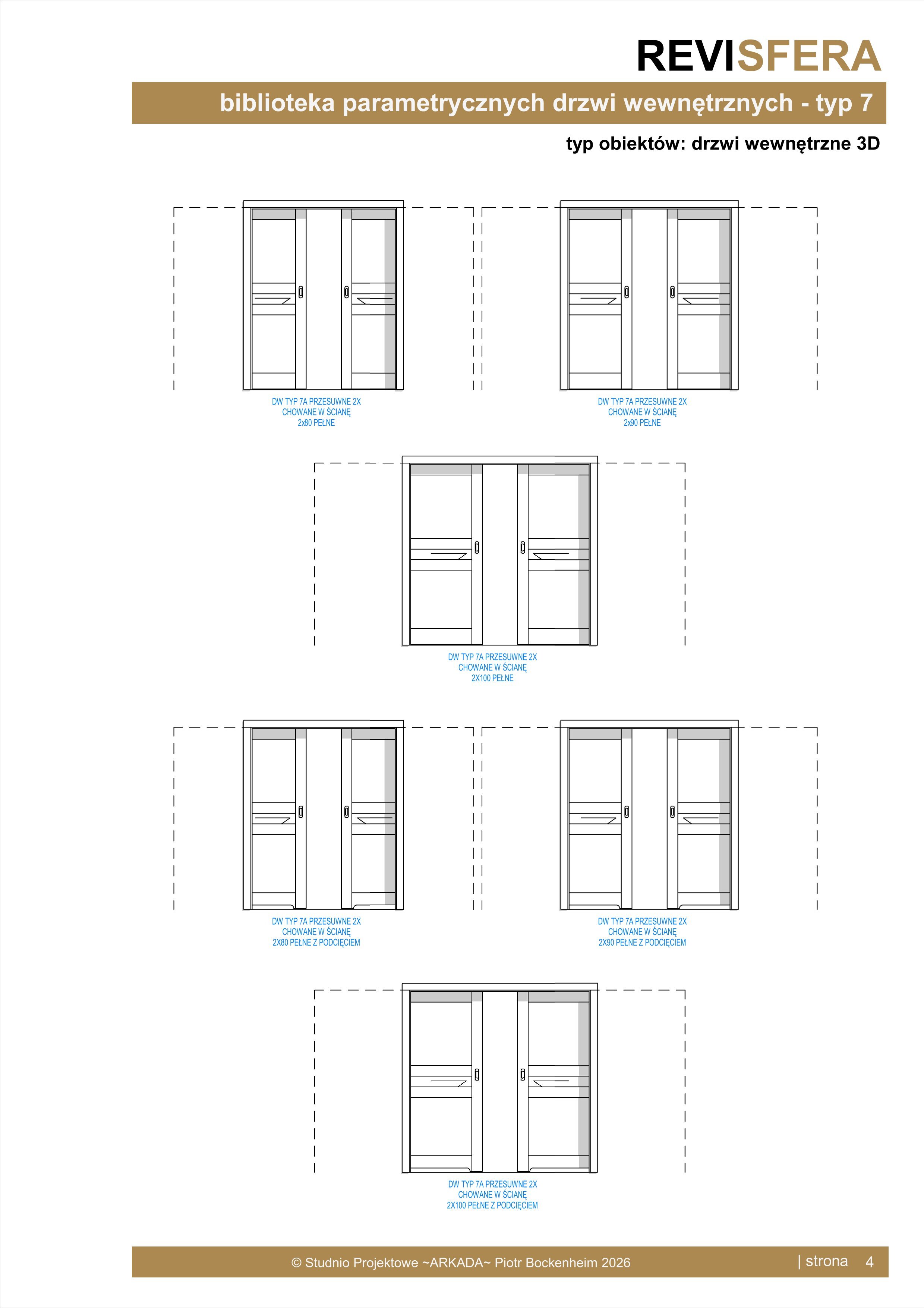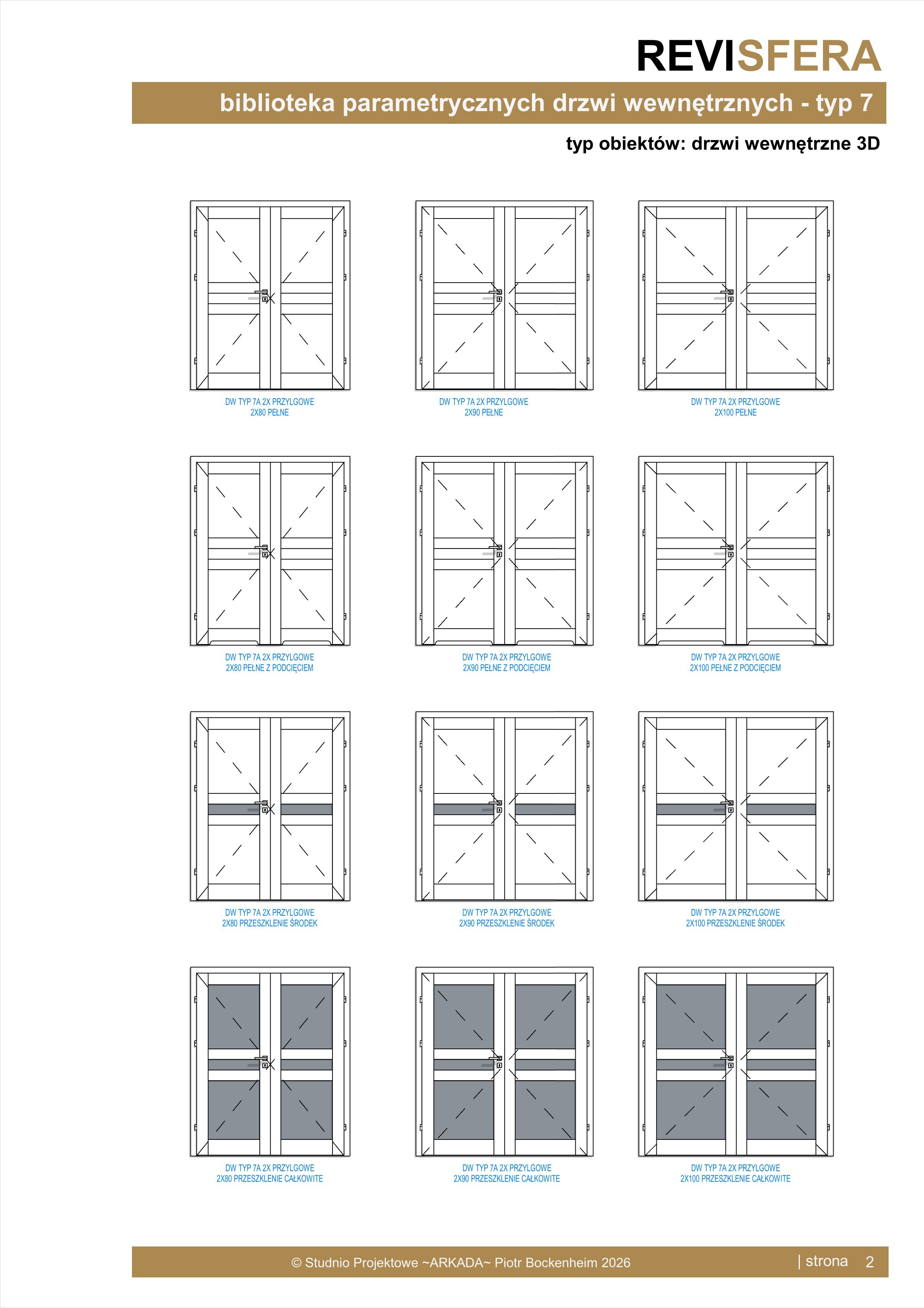 Biblioteka zawiera parametryczne, uniwersalne drzwi wewnętrzne drewnopochodne. Drzwi występują jako jedno- i dwuskrzydłowe, rozwierne oraz przesuwne nakładane oraz chowane w ścianę. Obiekty biblioteczne są w pełni parametryczne - możliwa jest zmiana wszystkich wymiarów. Sposób przygotowania obiektów umożliwia sterowanie widocznością progów, symbolami kierunku otwierania, poziomem uszczegółowienia, itp.