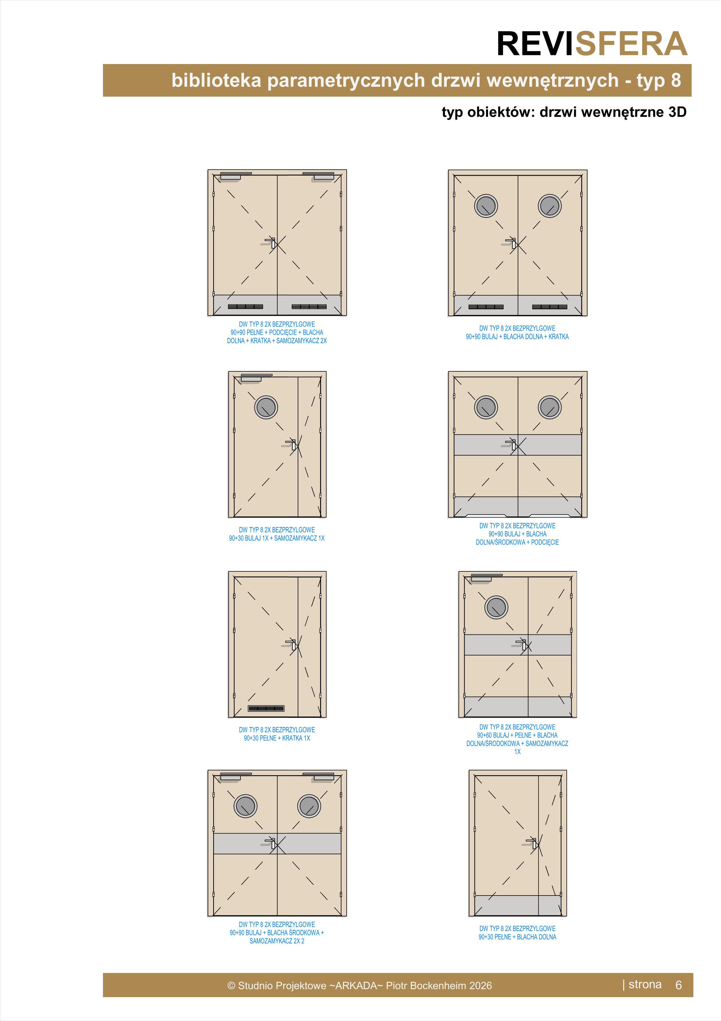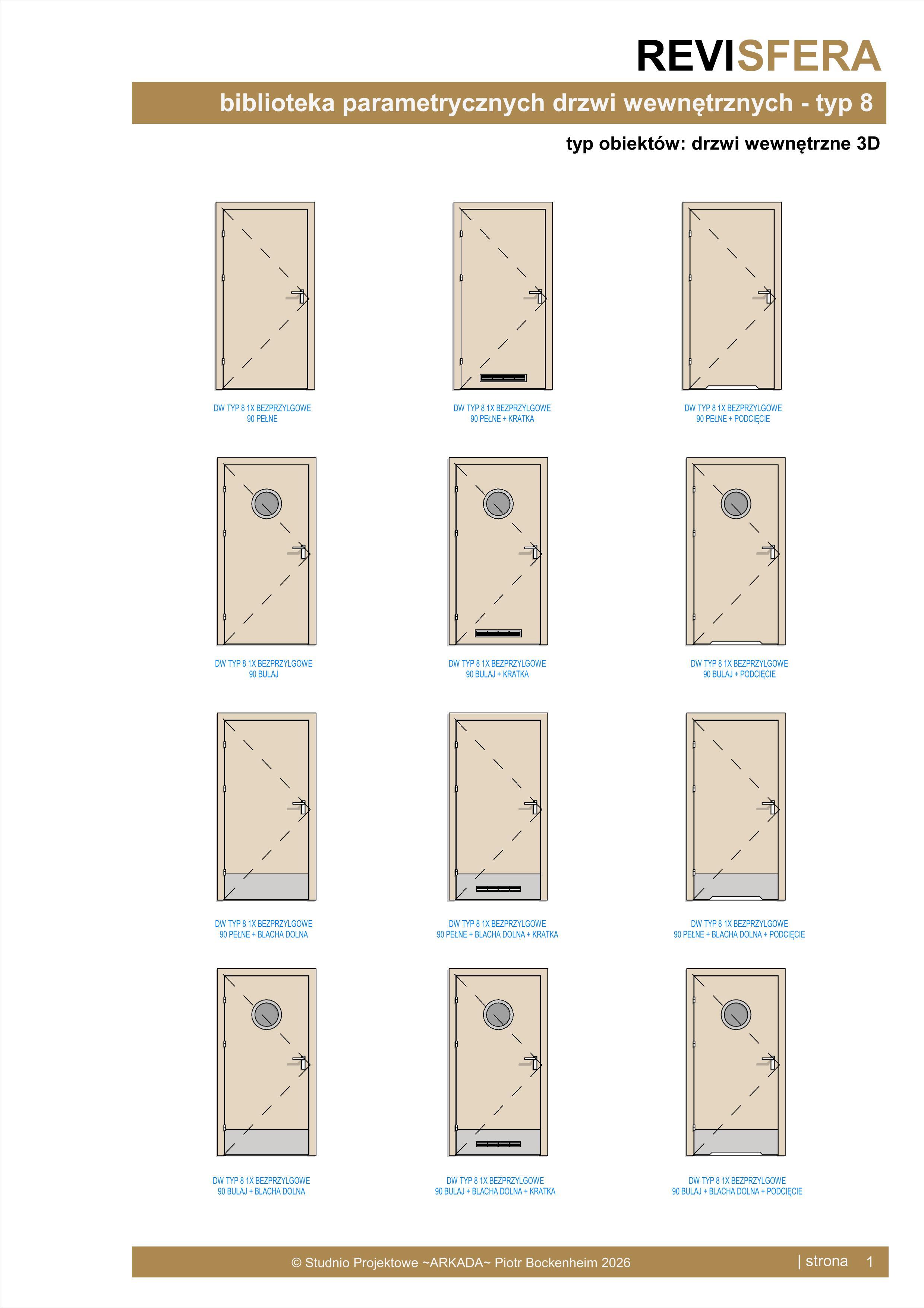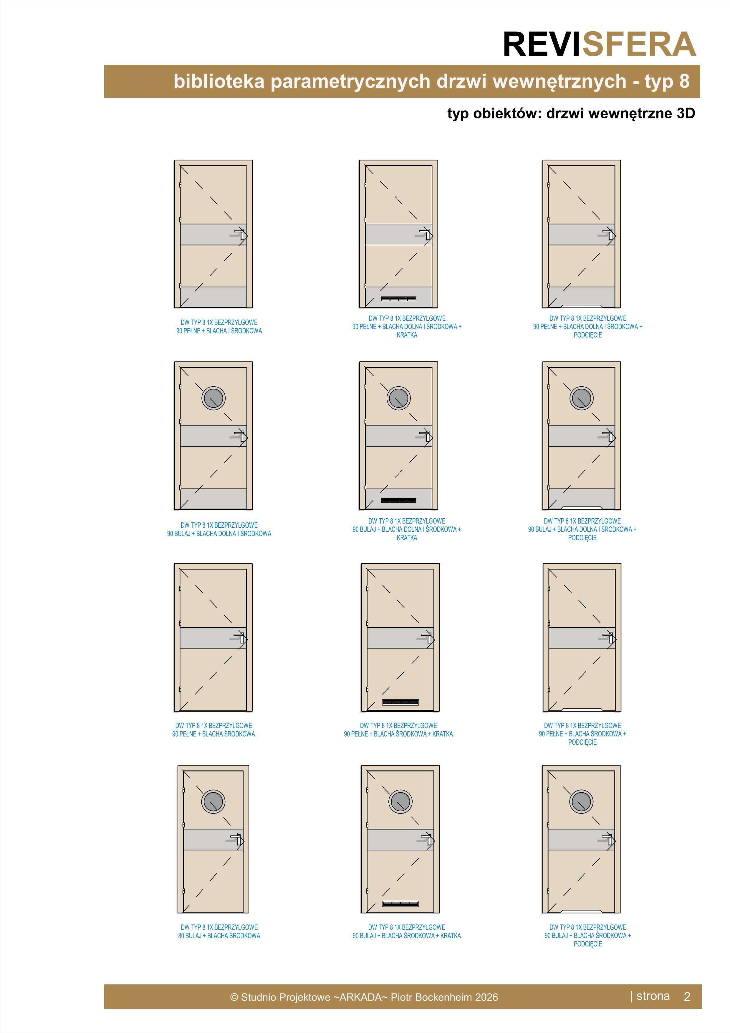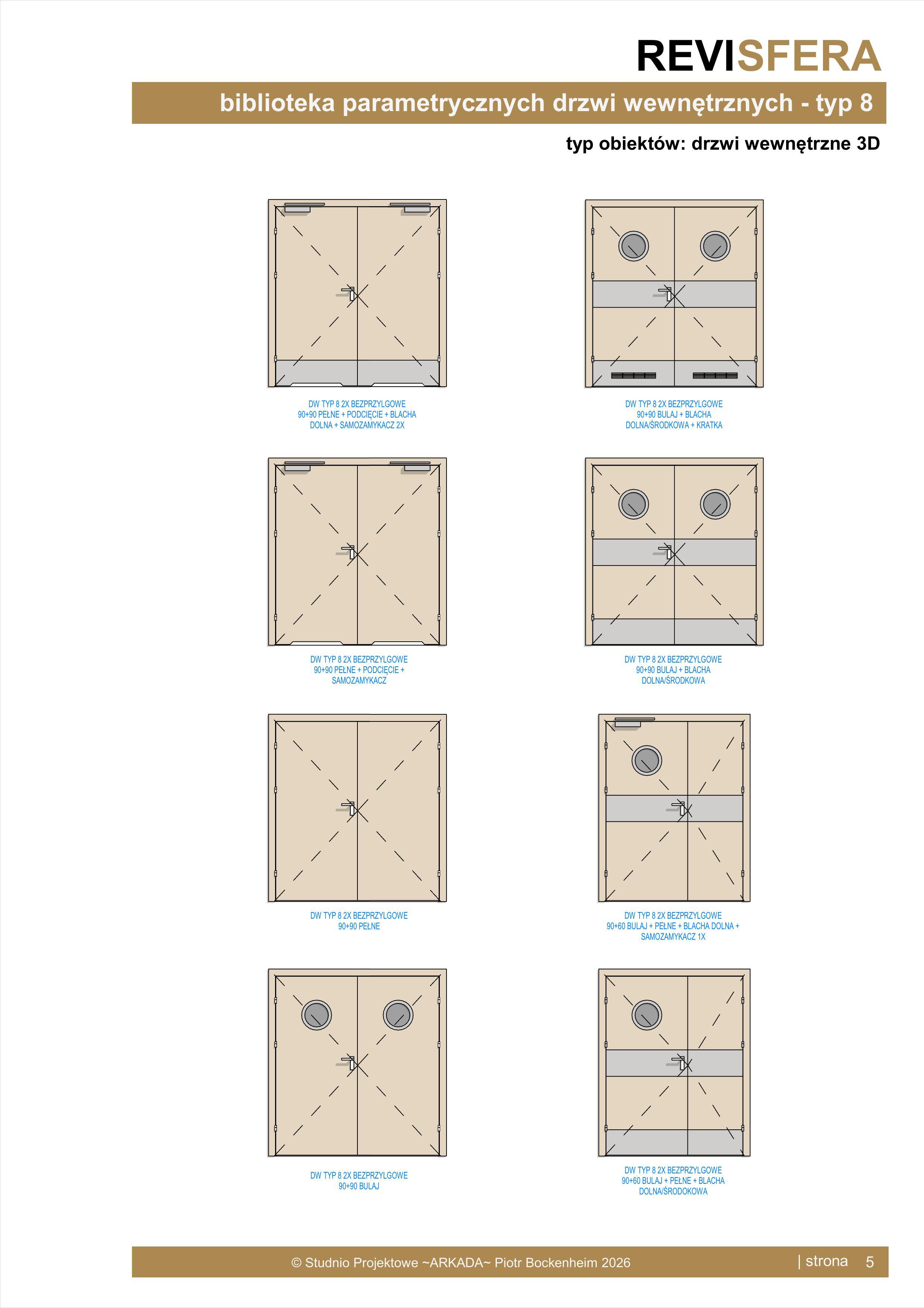 Biblioteka zawiera parametryczne, uniwersalne drzwi obiektowe wewnętrzne - drzwi jedno i dwuskrzydłowe, z dodatkowym wyposażeniem: kratkami i podcięciami wentylacyjnymi, bulajami, okładzinami ochronnymi z blachy, samozamykaczami. Obiekty są w pełni parametryczne, co pozwala na dowolne dopasowanie ich wymiarów oraz materiałów. Sposób przygotowania obiektów umożliwia sterowanie widocznością linii progu, symbolami kierunku otwierania, wyposażeniem drzwi itp.