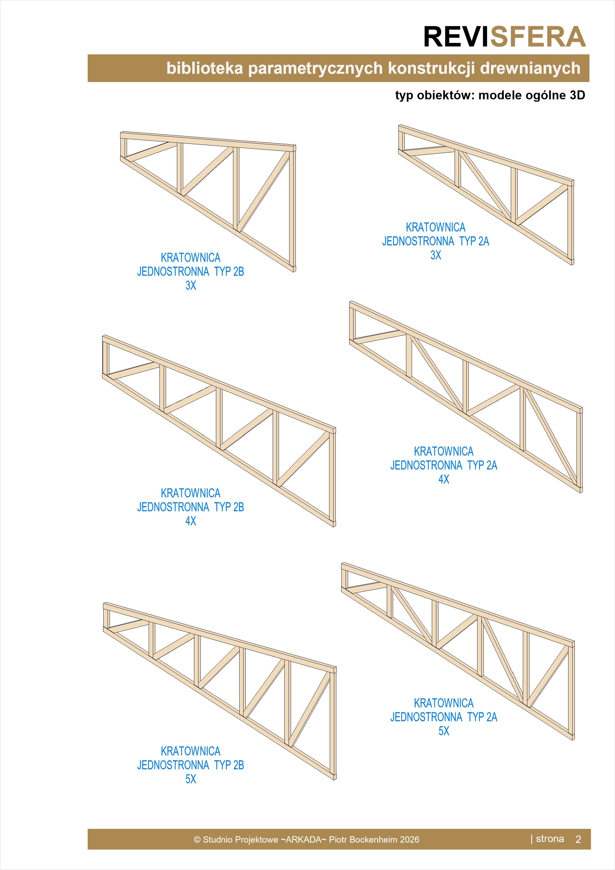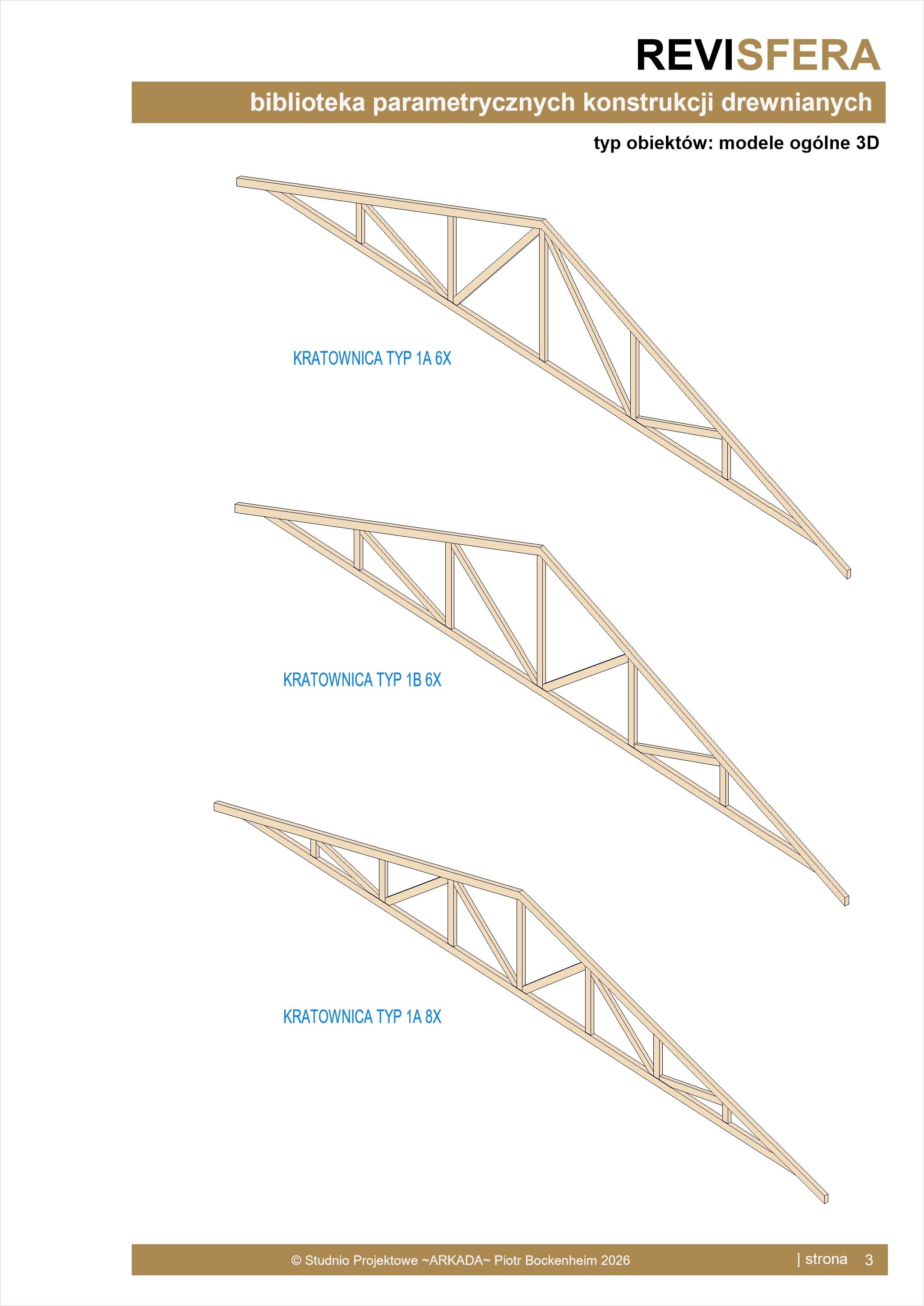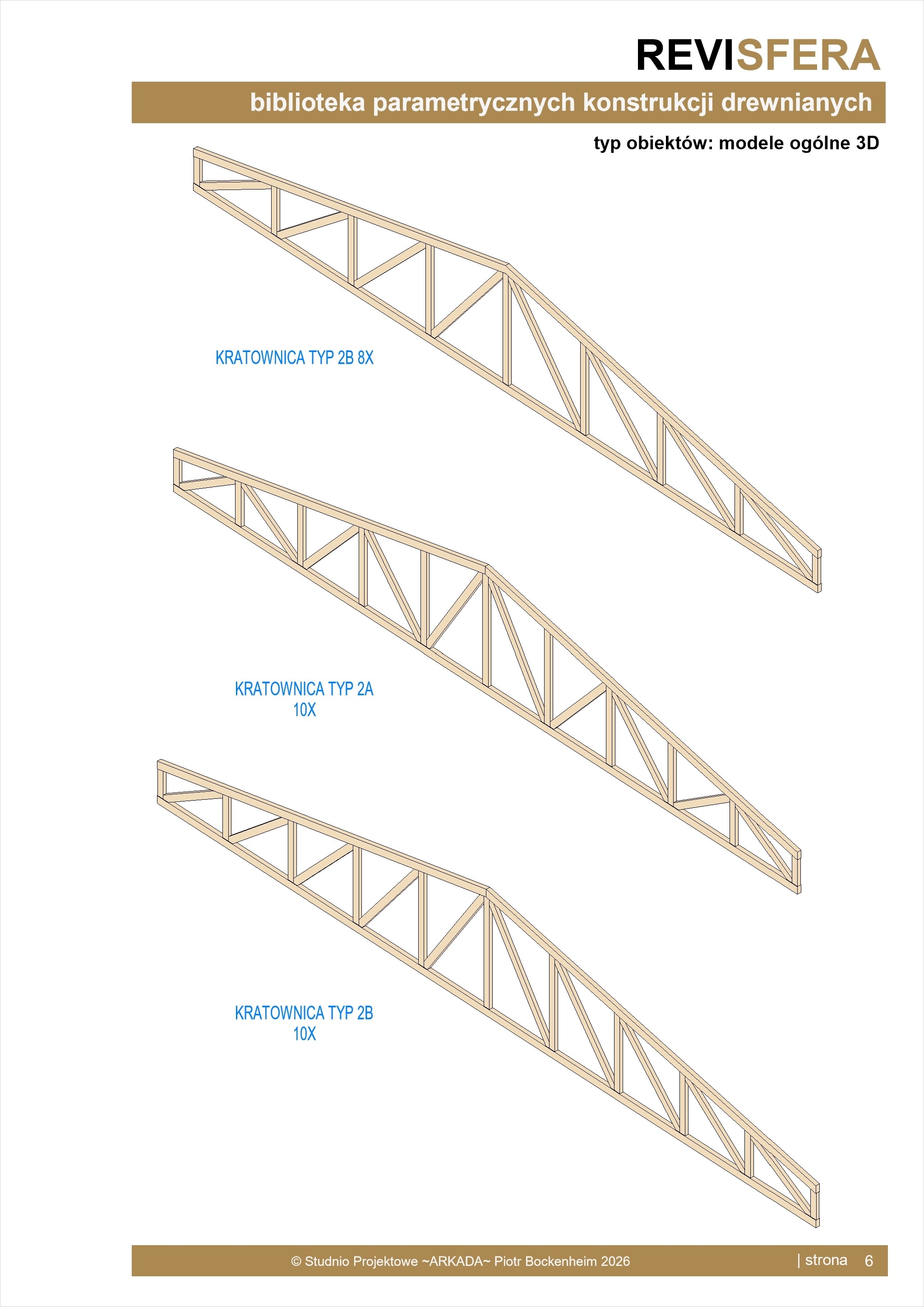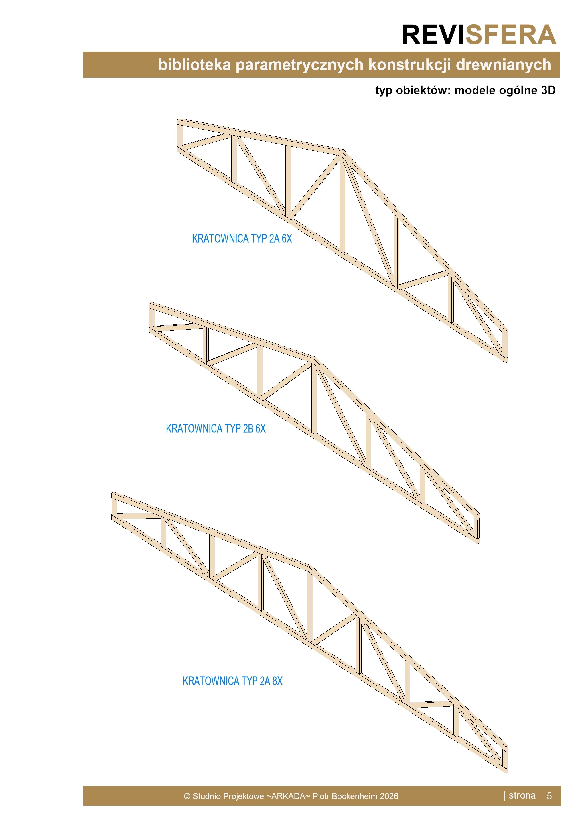 Biblioteka zawiera parametryczne, uniwersalne elementy konstrukcji drewnianych: dźwigary, krokwie, kleszcze, itp. Obiekty są w pełni parametryczne, co pozwala na dowolne dopasowanie ich wymiarów oraz materiałów (sterowanie za pomocą stylów obiektów e programie Revit). Sposób przygotowania obiektów umożliwia modyfikowanie zestawów oraz tworzenie nowych zestawów z gotowych modułów.