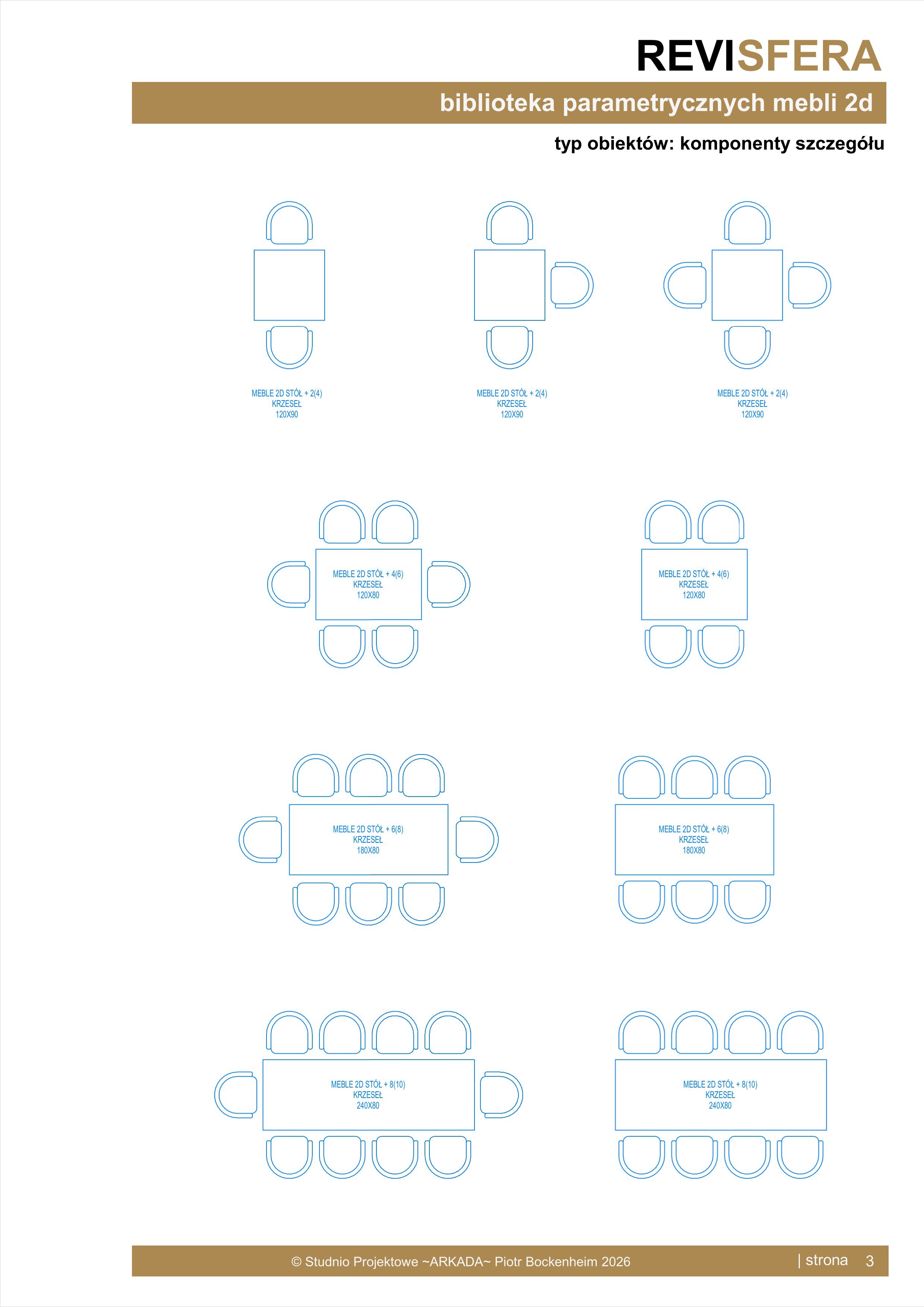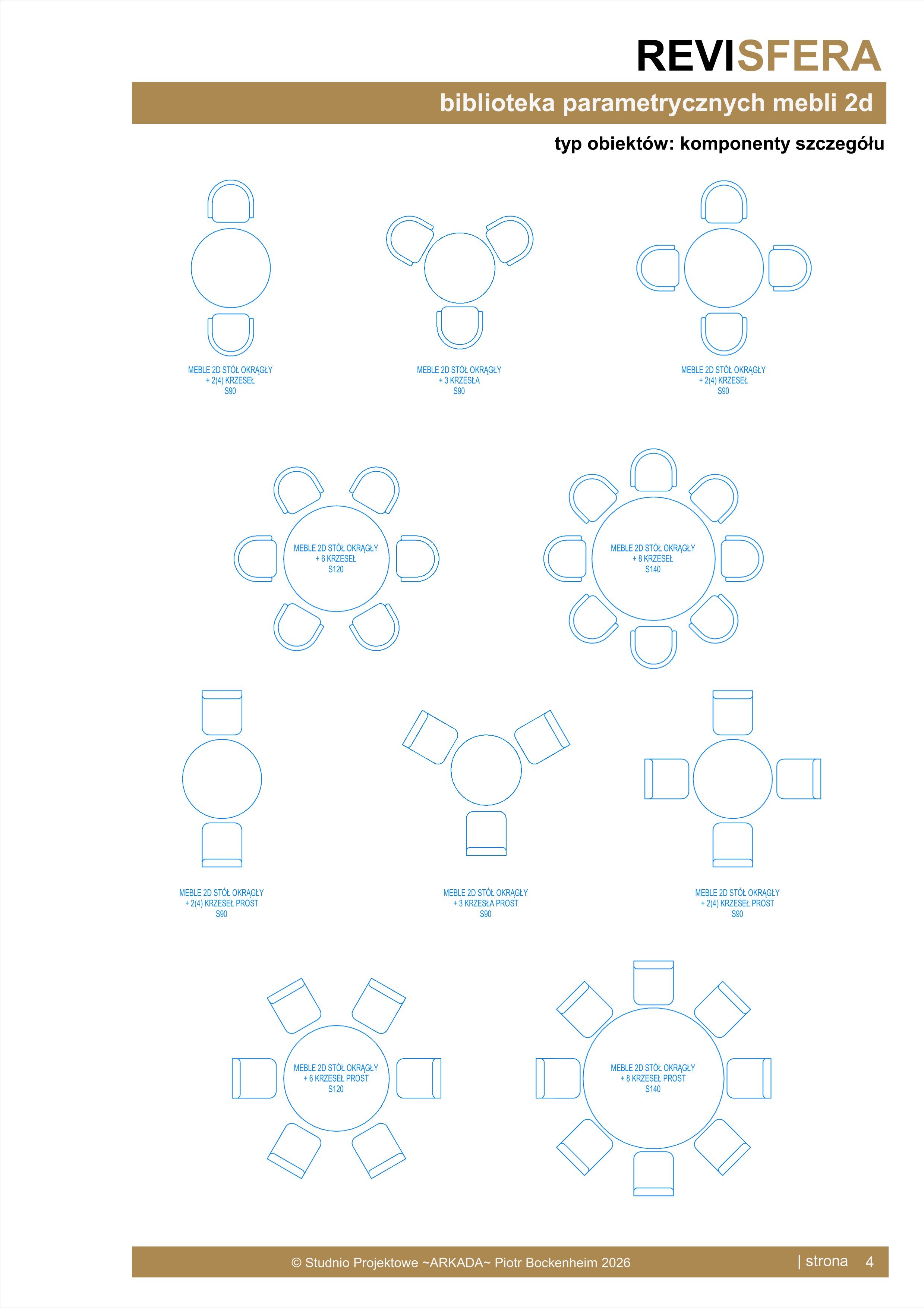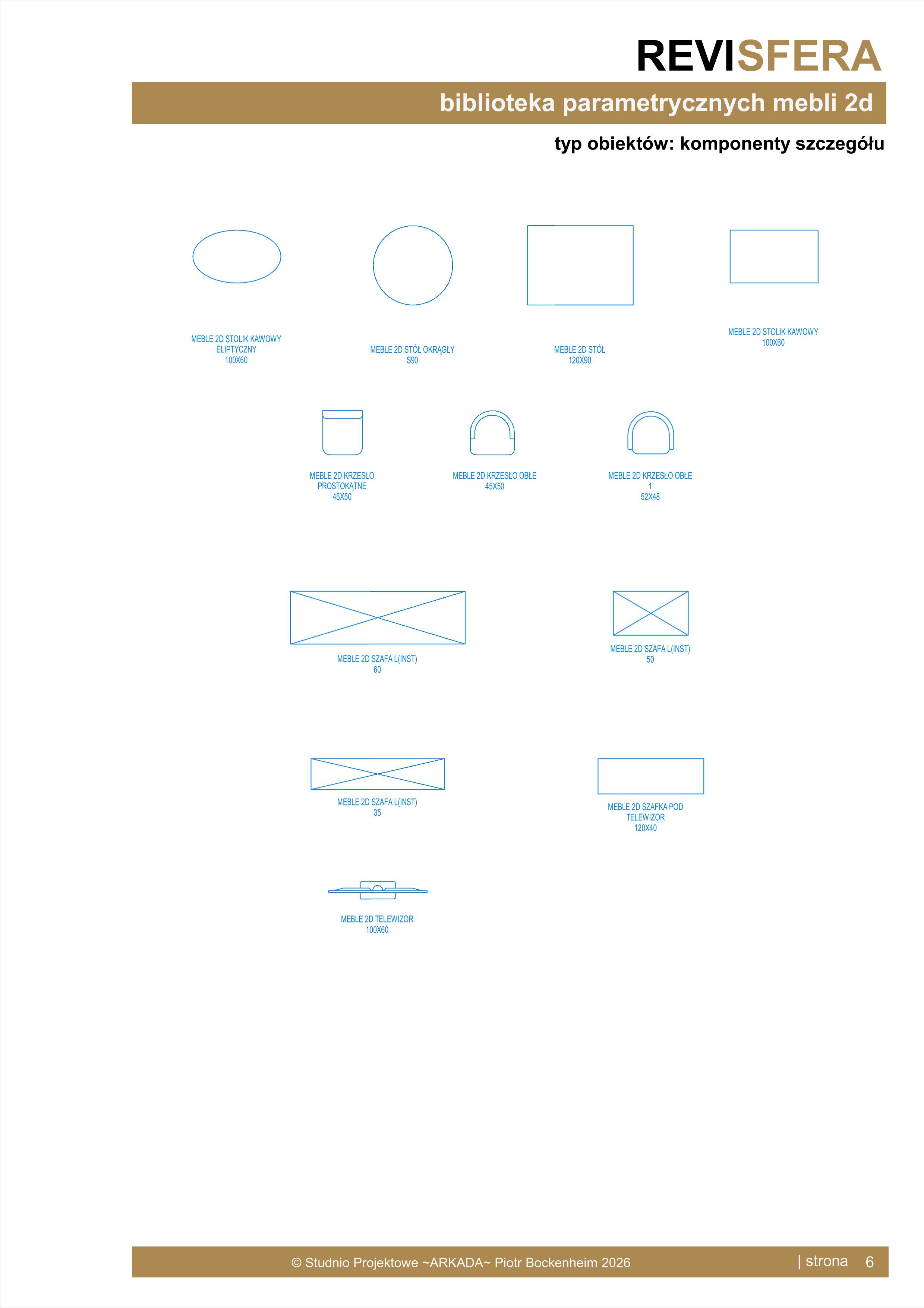 Biblioteka zawiera parametryczne, uniwersalne obiekty meblarskie 2D (komponenty detali): stoły, krzesła, kanapy, łóżka, itp. Obiekty są w pełni parametryczne, co pozwala na dowolne dopasowanie ich wymiarów oraz wyglądu.