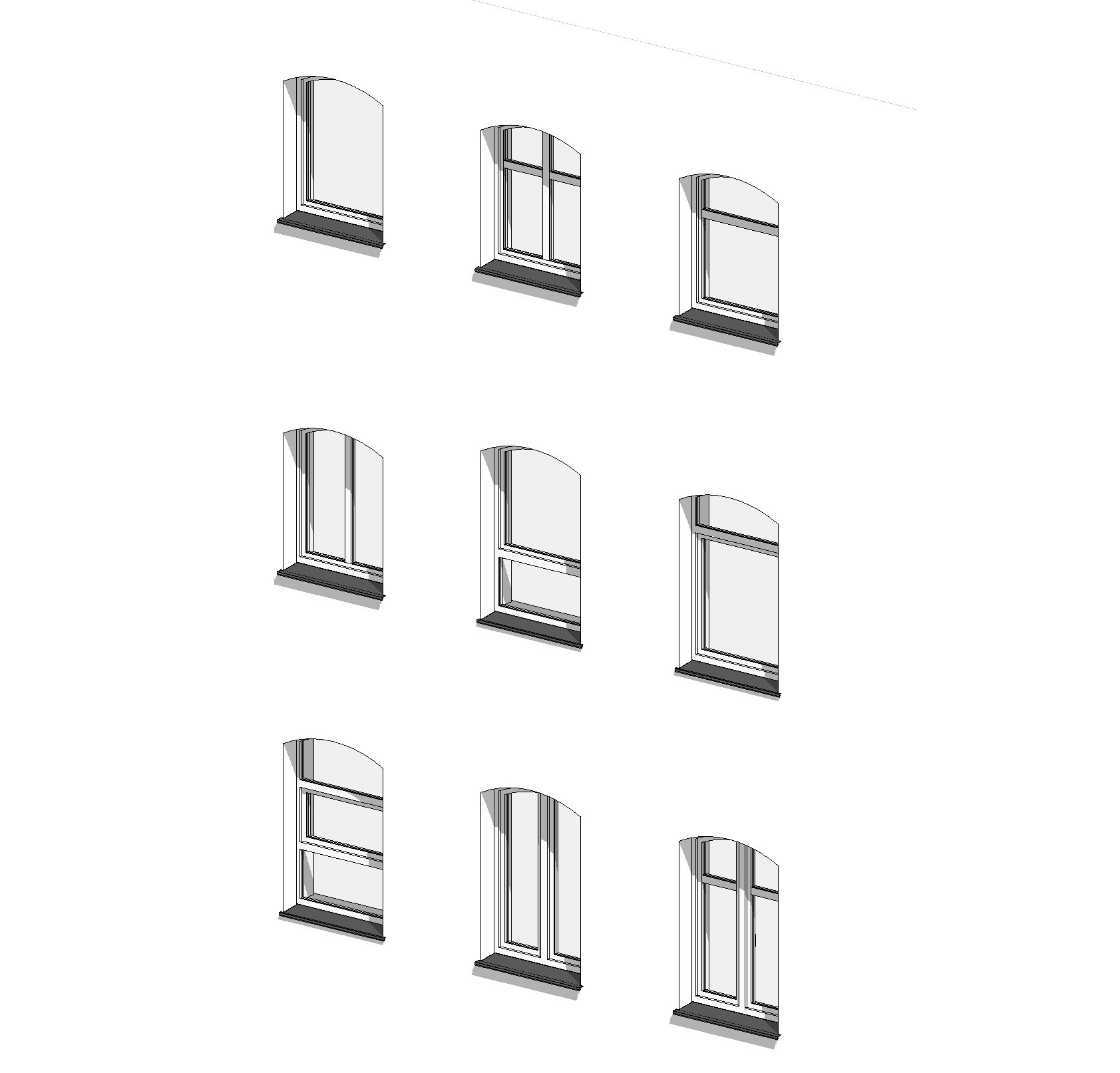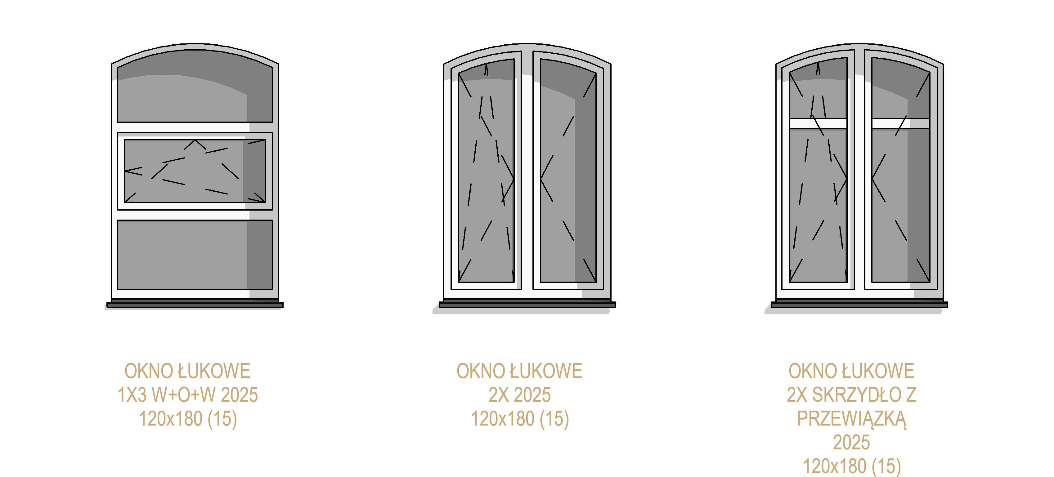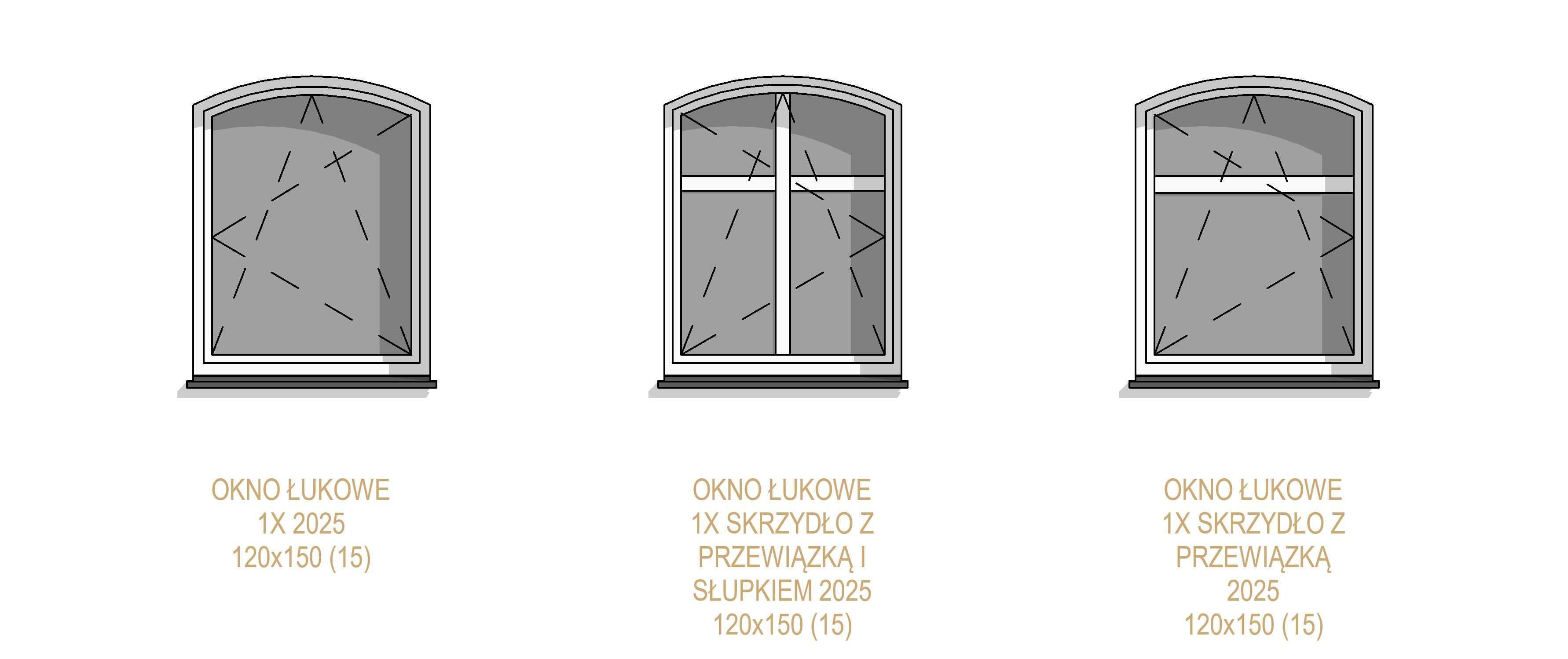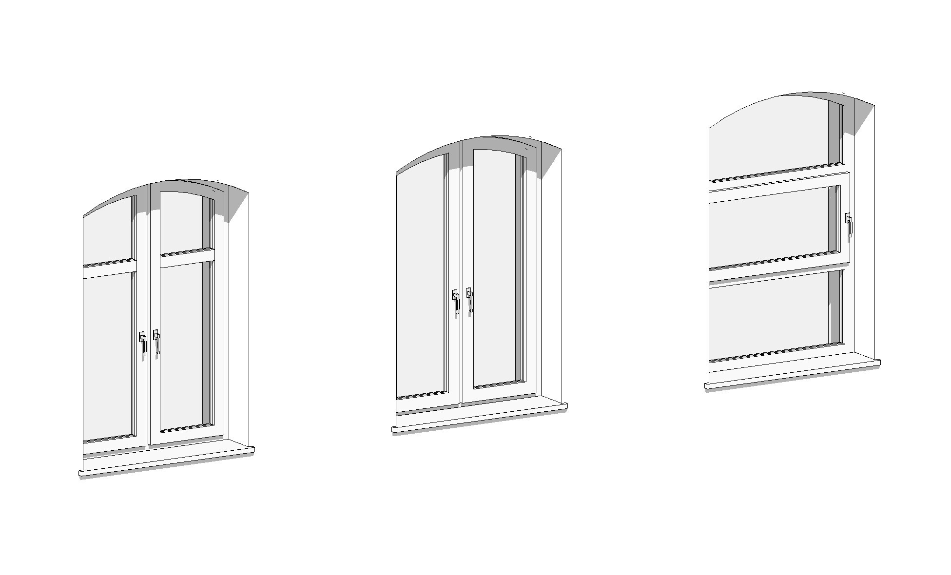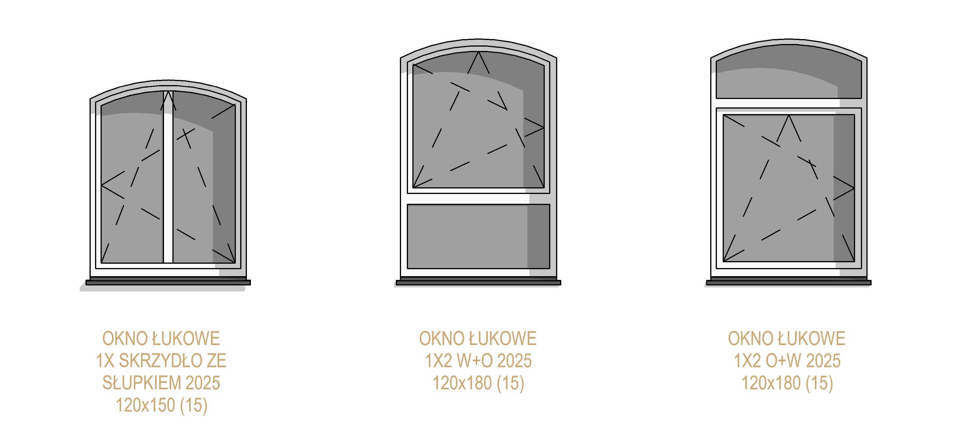Biblioteka zawiera parametryczne, uniwersalne okna łukowe jedno oraz dwuskrzydłowe. Okna występują w kilku wariantach podziału, otwory okienne posiadają regulowane węgarki. Obiekty są w pełni parametryczne, co pozwala na dowolne dopasowanie ich wymiarów oraz materiałów (sterowanie za pomocą stylów obiektów w programie Revit). Sposób przygotowania obiektów umożliwia sterowanie widocznością podokienników, linii nadproży, symbolami kierunku otwierania, itp.
