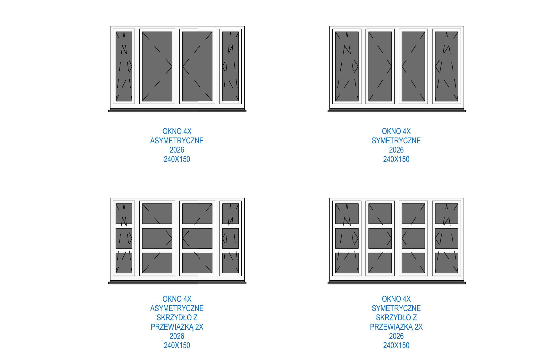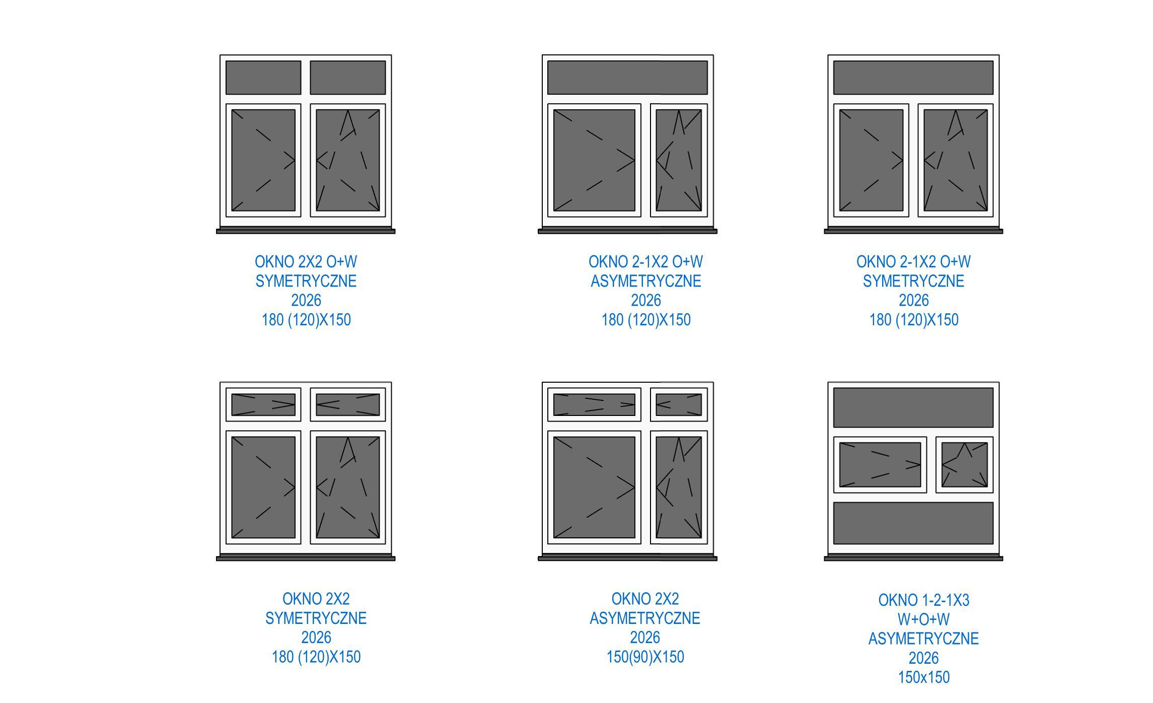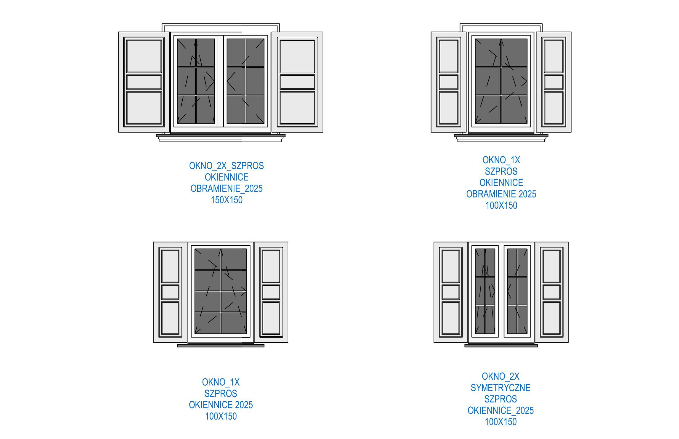 Biblioteka zawiera parametryczne, uniwersalne okna standardowe. Okna występują w kilku wariantach podziału, otwory okienne posiadają regulowane węgarki. Obiekty są w pełni parametryczne, co pozwala na dowolne dopasowanie ich wymiarów oraz materiałów (sterowanie za pomocą stylów obiektów w programie Revit). Sposób przygotowania obiektów umożliwia sterowanie widocznością podokienników, linii nadproży, symbolami kierunku otwierania, itp.