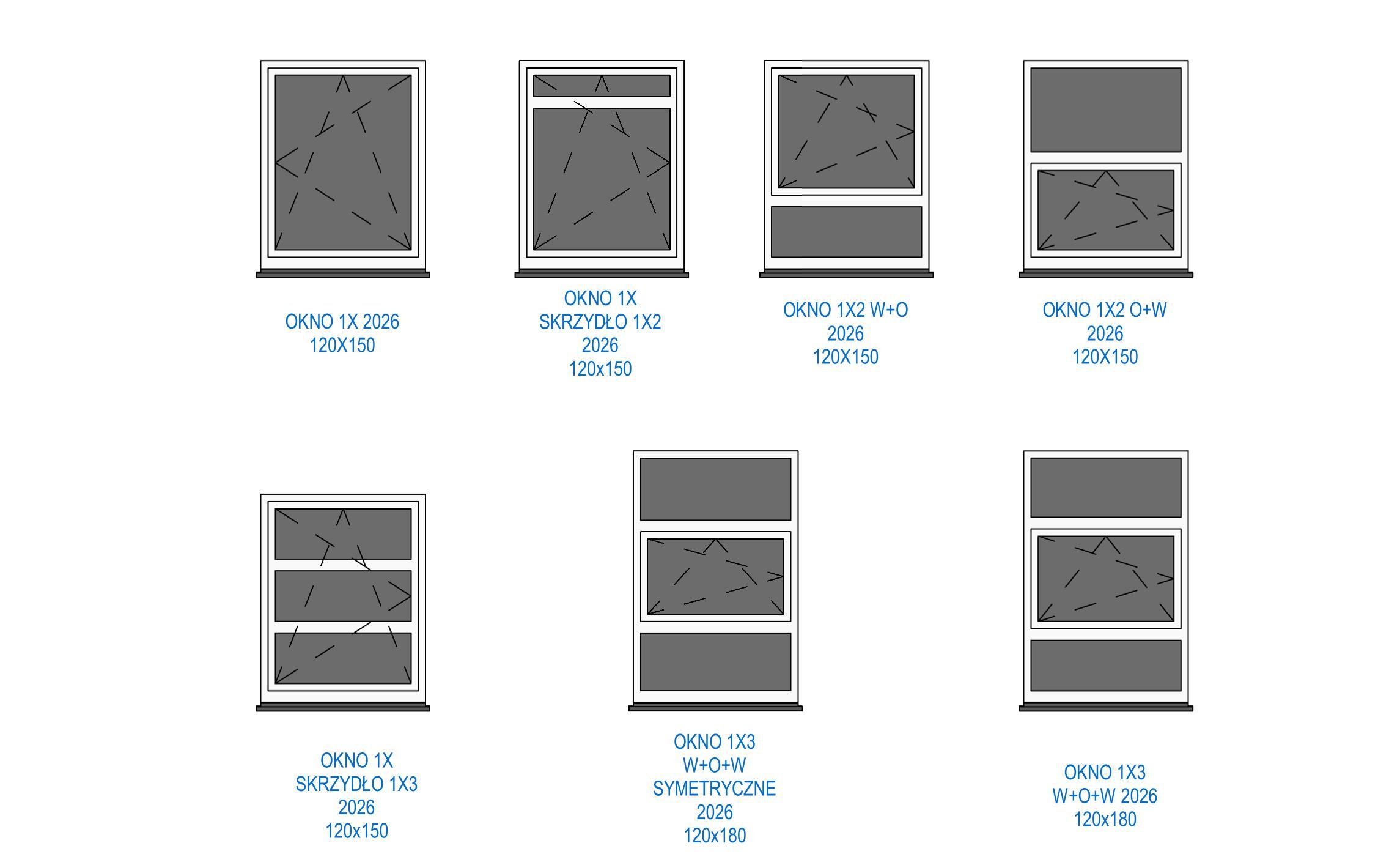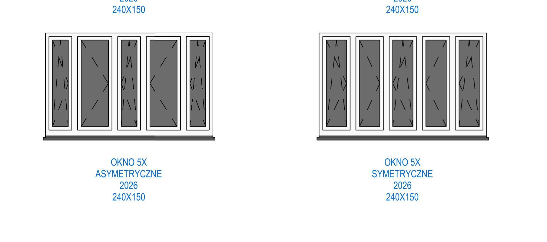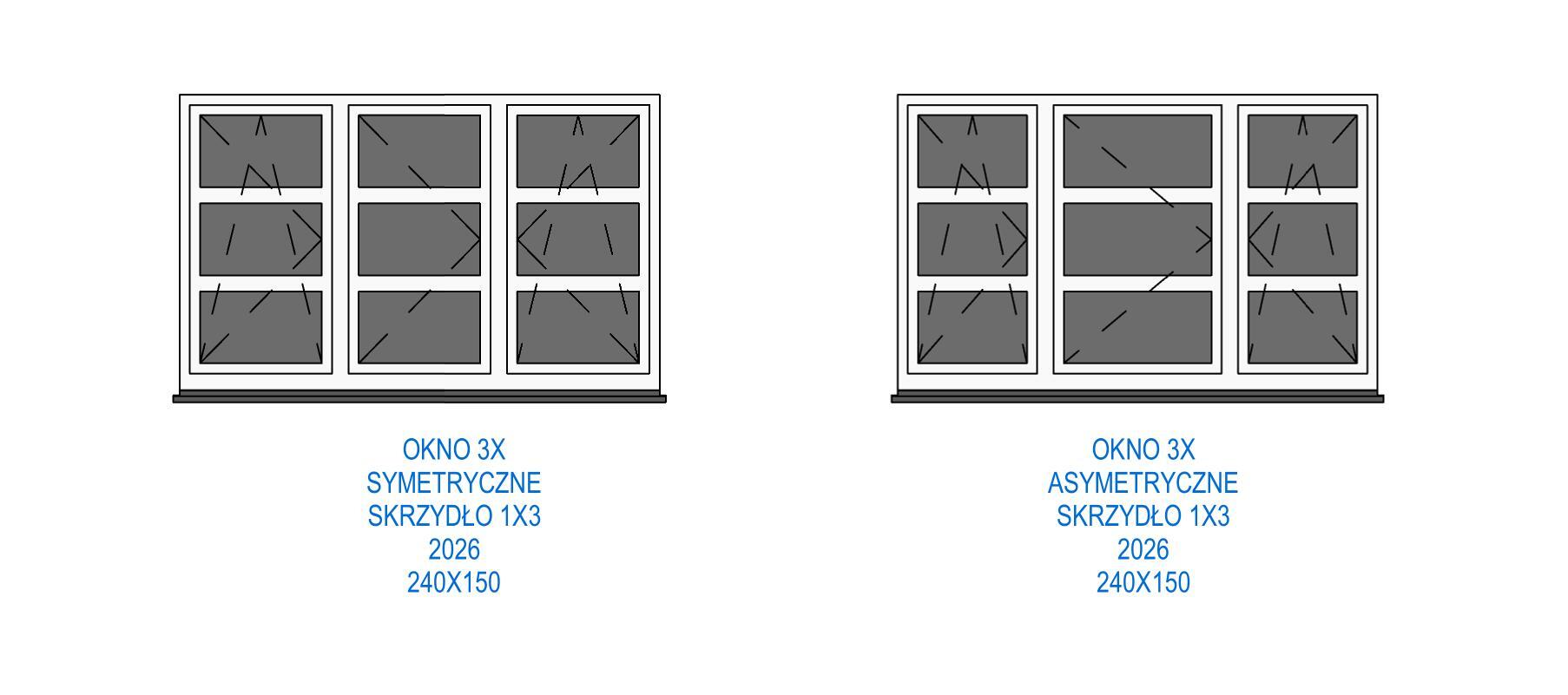 Biblioteka zawiera parametryczne, uniwersalne okna standardowe. Okna występują w kilku wariantach podziału, otwory okienne posiadają regulowane węgarki. Obiekty są w pełni parametryczne, co pozwala na dowolne dopasowanie ich wymiarów oraz materiałów (sterowanie za pomocą stylów obiektów w programie Revit). Sposób przygotowania obiektów umożliwia sterowanie widocznością podokienników, linii nadproży, symbolami kierunku otwierania, itp.