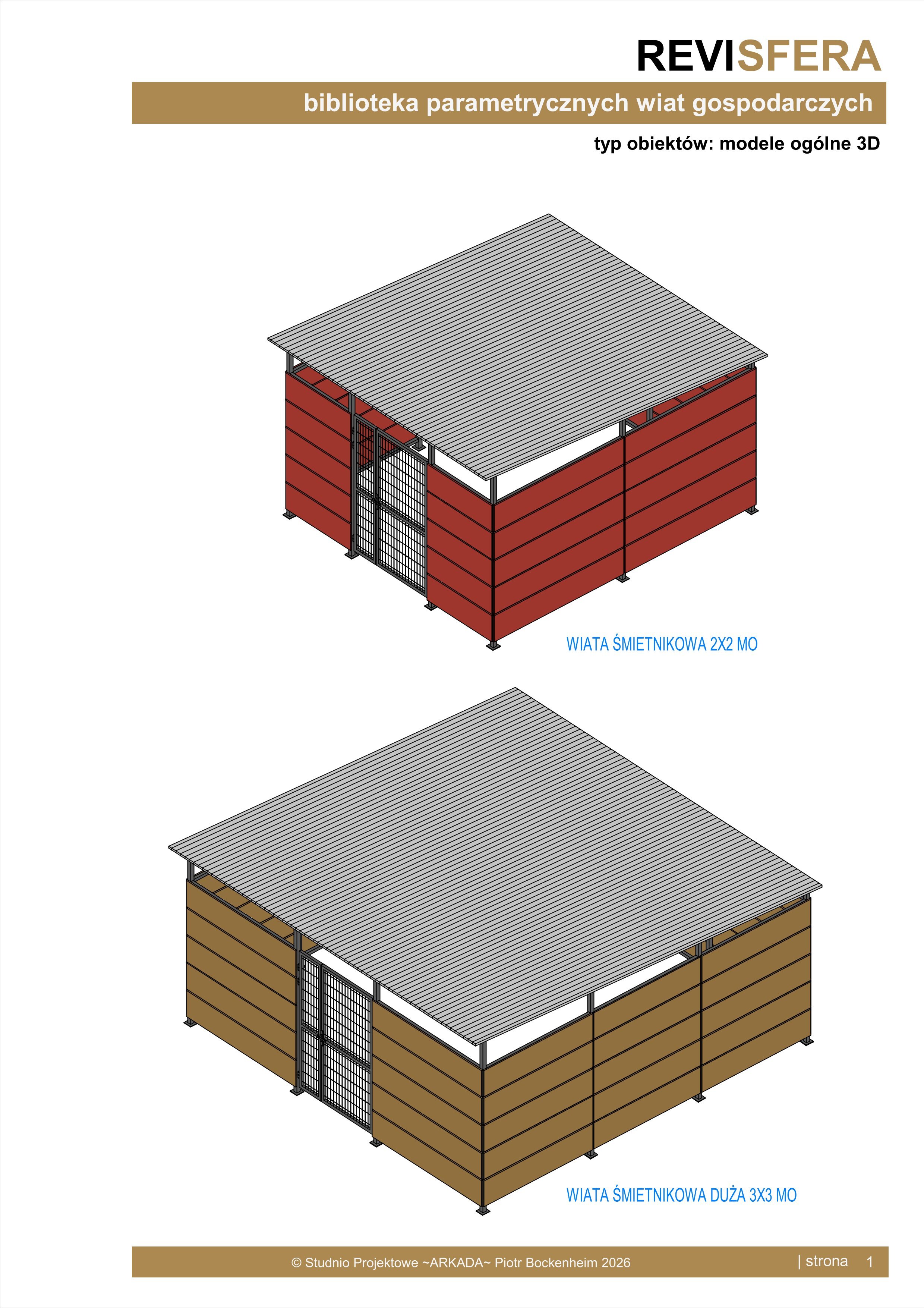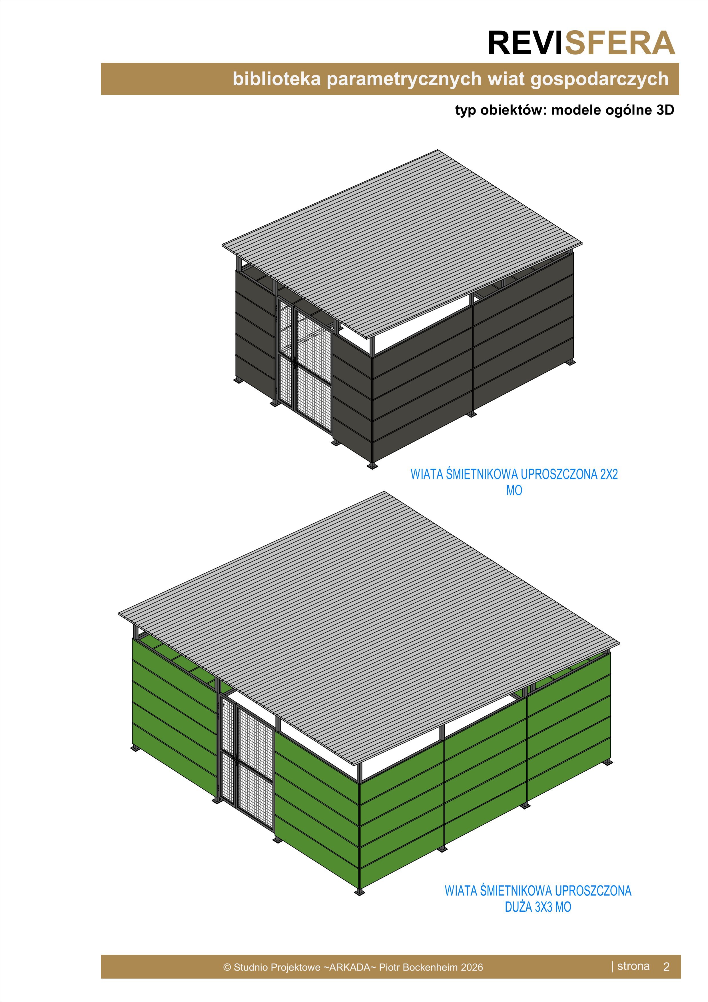 Biblioteka zawiera parametryczne, uniwersalne, panelowe wiaty gospodarcze o konstrukcji stalowej. Wiaty występują w dwóch wariantach konstrukcyjnych - moduł 2x2 oraz 3x3 oraz dwóch wariantach szczegółowości (dotyczy szczegółowości siatki wypełniającej). Obiekty są w pełni parametryczne, co pozwala na dowolne dopasowanie ich wymiarów oraz materiałów.