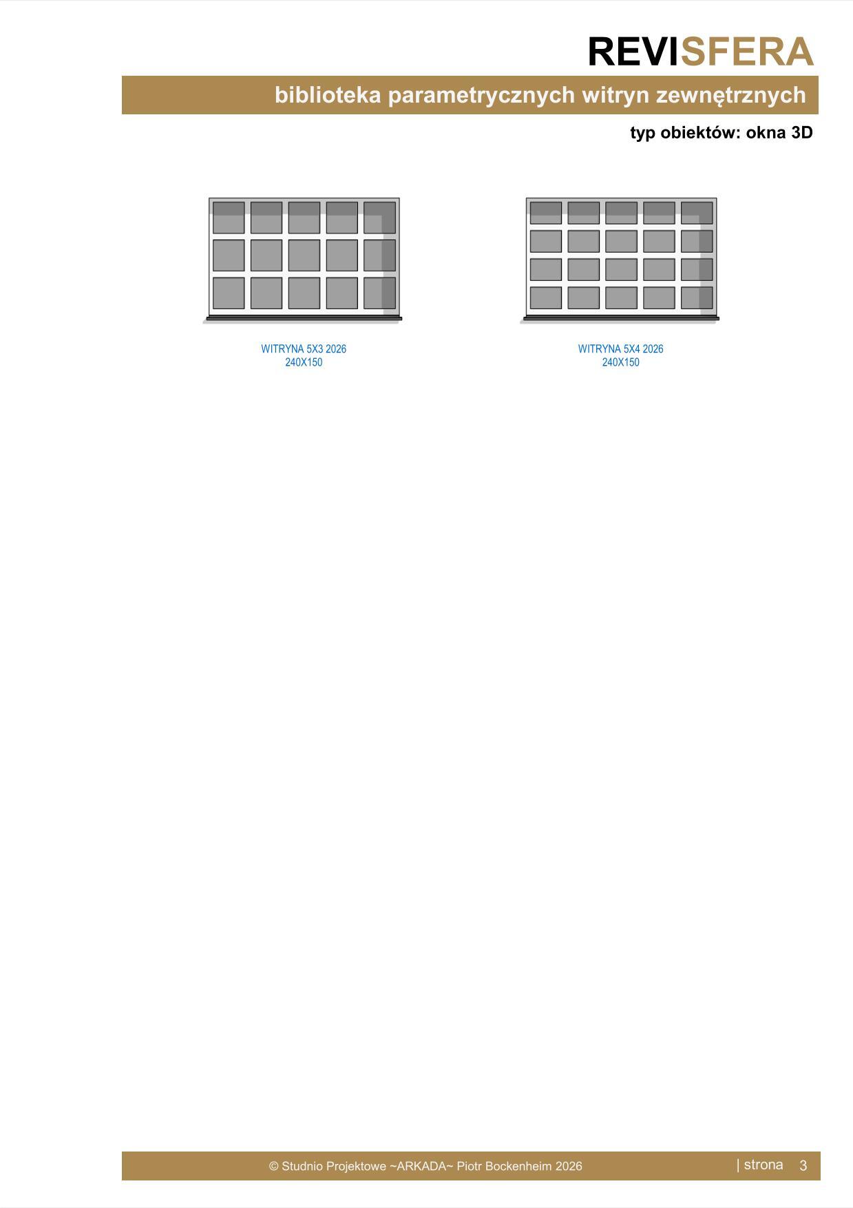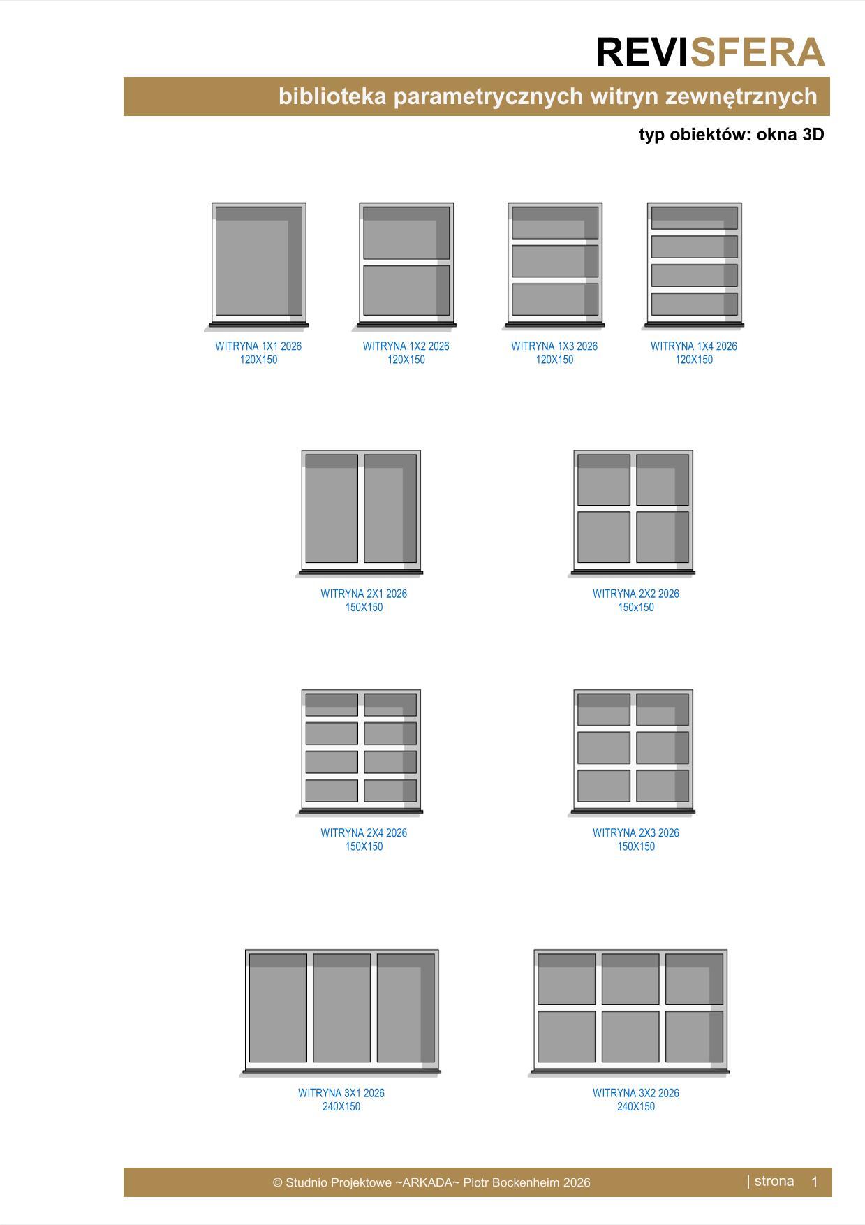 Biblioteka zawiera parametryczne, uniwersalne witryny zewnętrzne, prostokątne. Witryny występują w różnych wariantach podziału, otwory posiadają regulowane węgarki. Obiekty są w pełni parametryczne, co pozwala na dowolne dopasowanie ich wymiarów oraz materiałów (sterowanie za pomocą stylów obiektów e programie Revit). Sposób przygotowania obiektów umożliwia sterowanie widocznością podokienników, linii nadproży, itp.