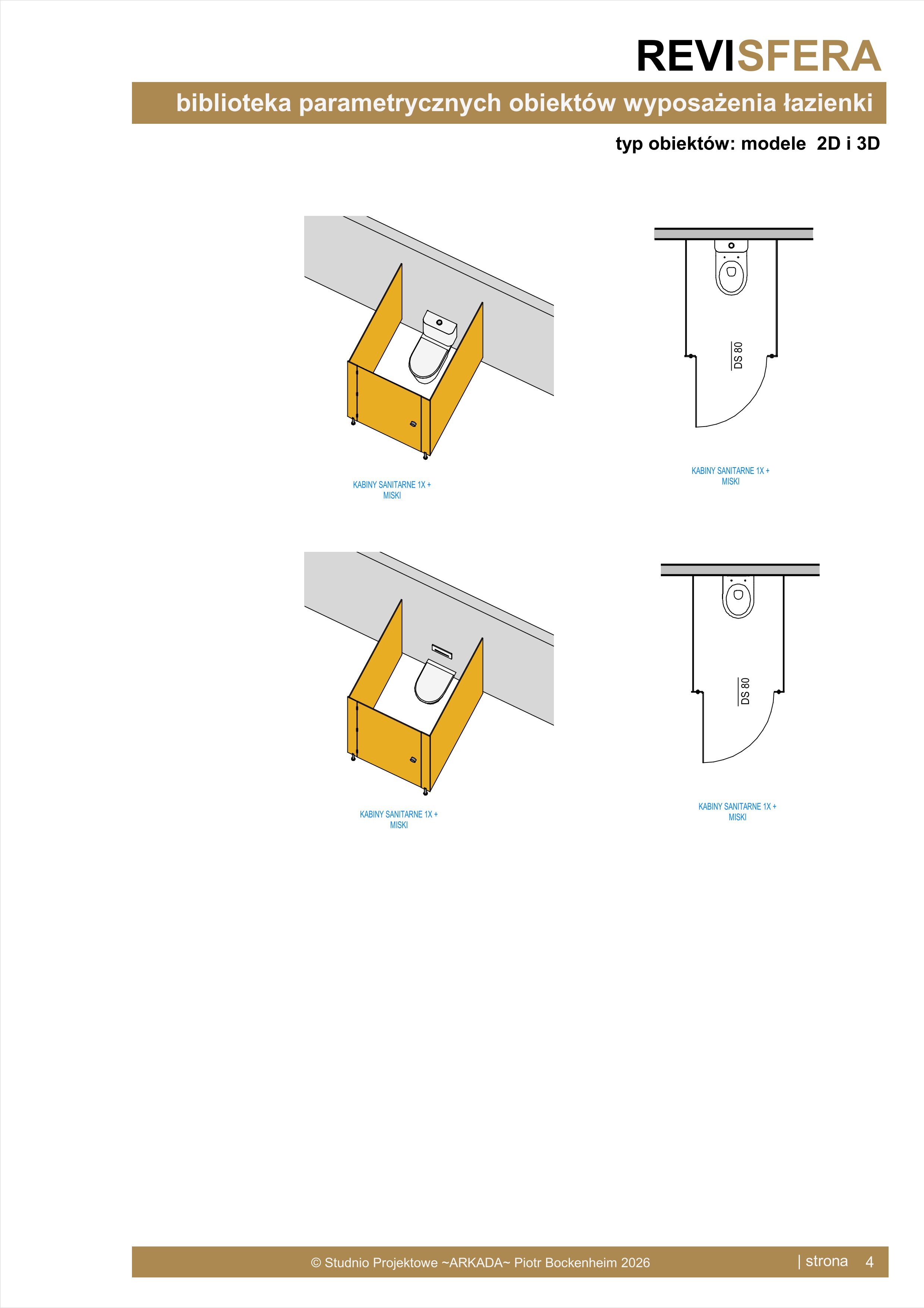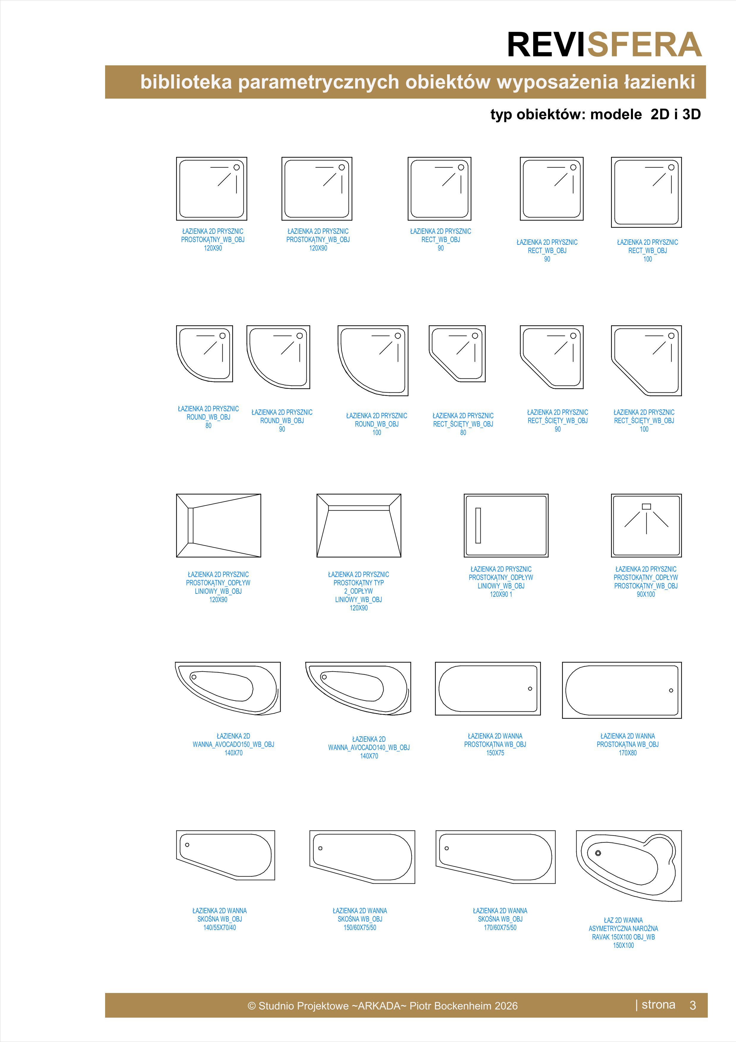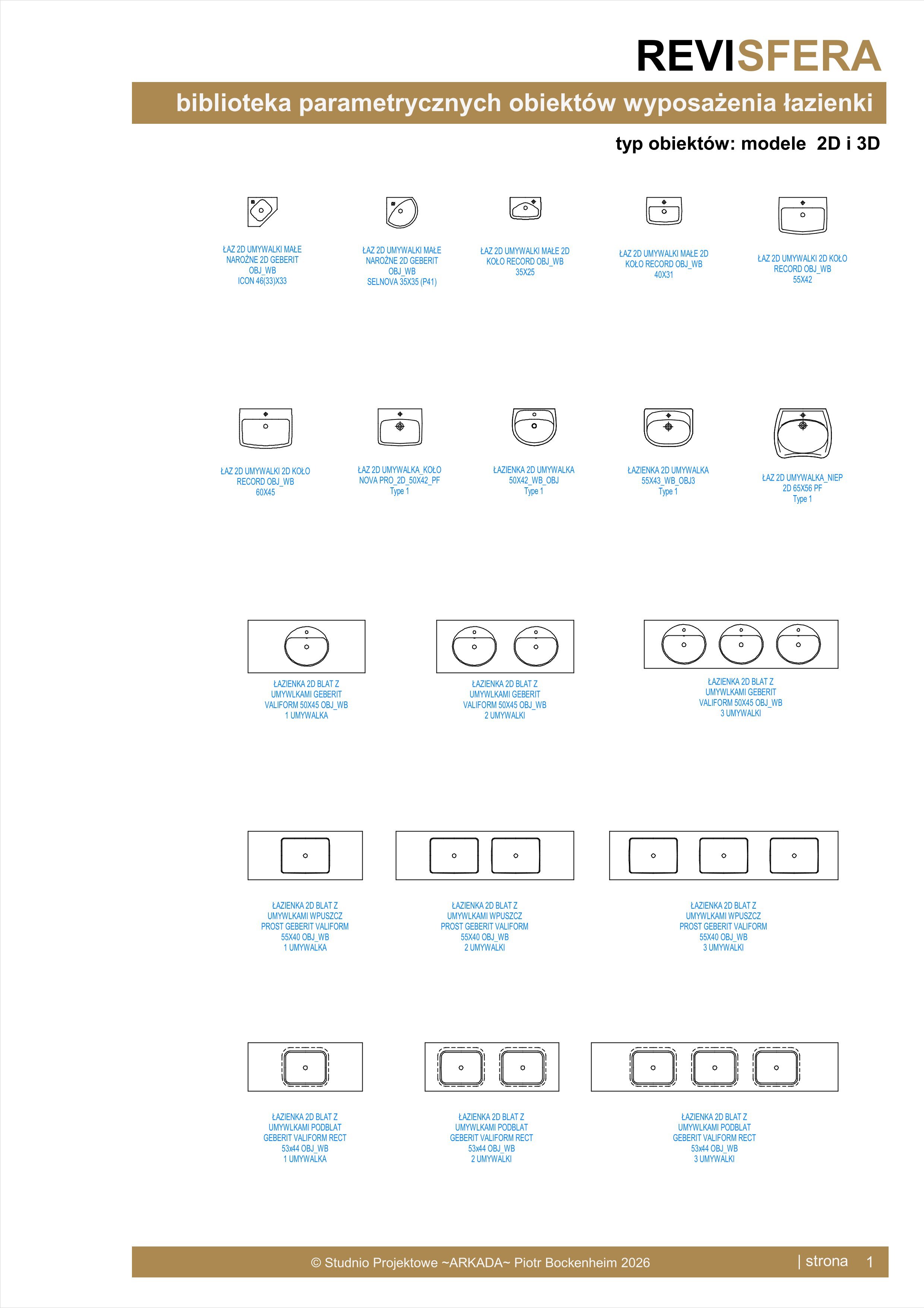 Biblioteka zawiera w większości sparametryzowane elementy wyposażenia łazienek: umywalki, miski toaletowe, prysznice, wanny, zlewy gospodarcze oraz kabiny sanitarne modułowe. Modułowe kabiny sanitarne występują z miskami wiszącymi i stojącymi, jako wolnostojące lub wnękowe. Biblioteka zawiera zarówno obiekty dwuwymiarowe, jak i trójwymiarowe.
