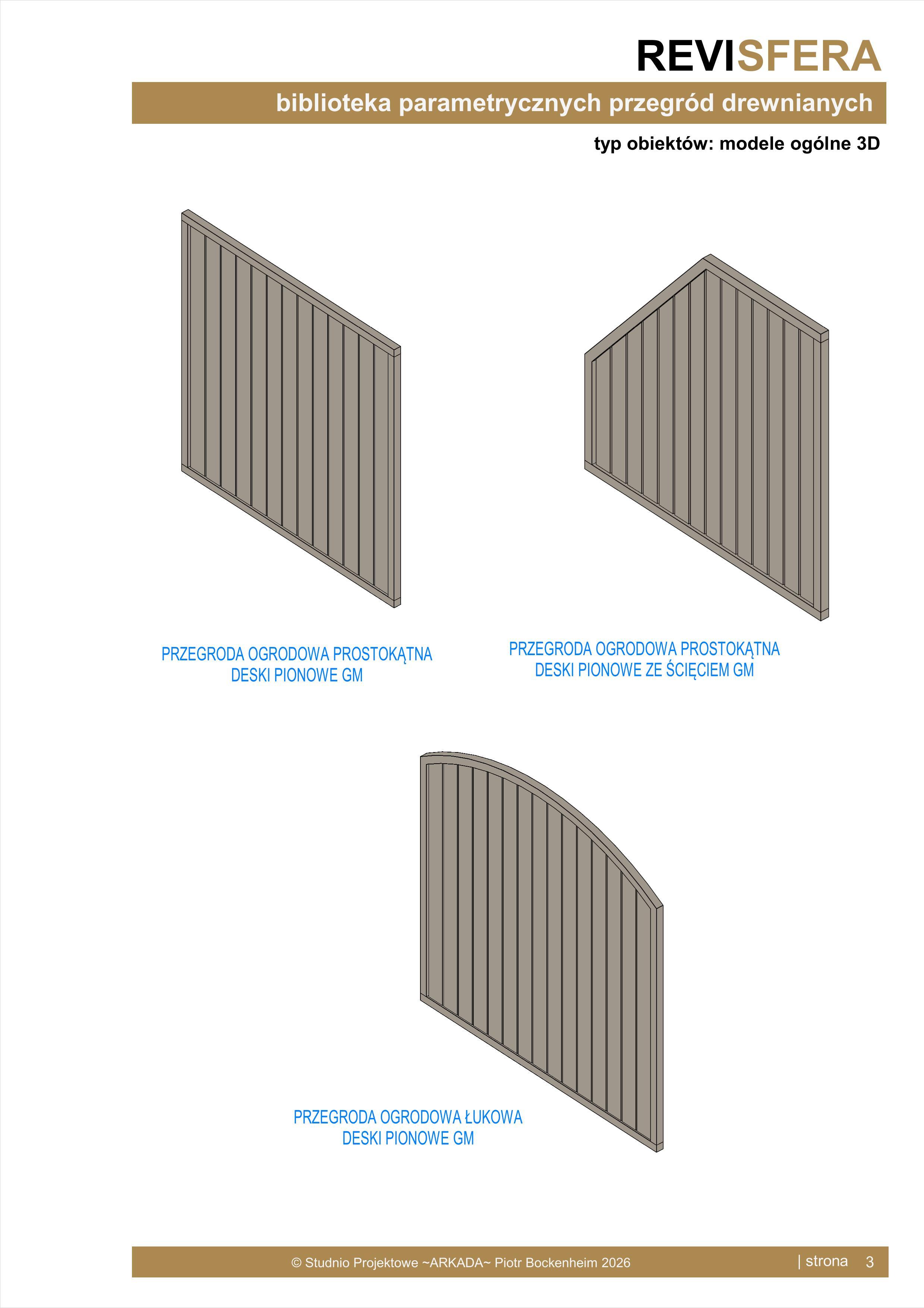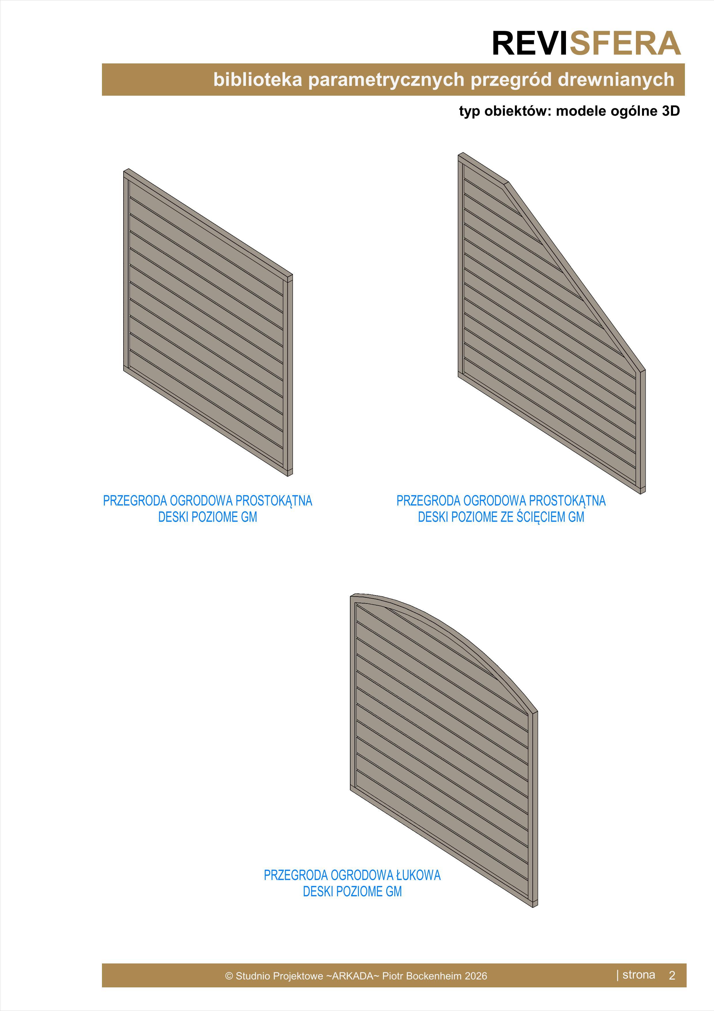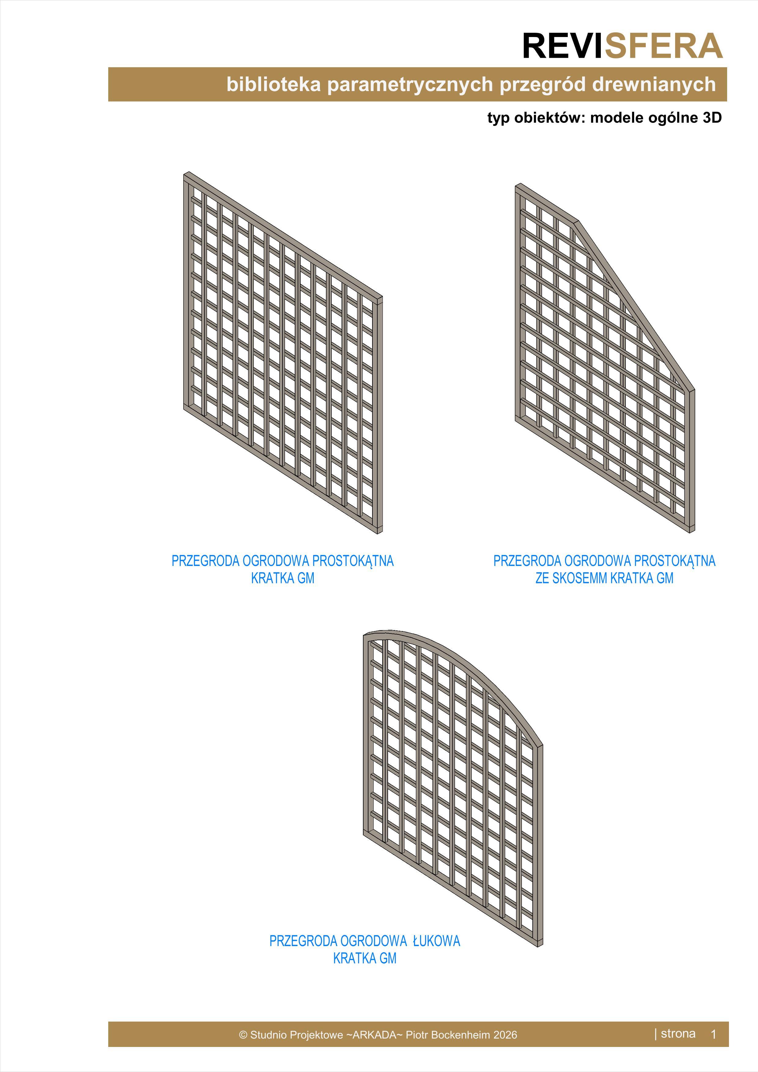Biblioteka zawiera parametryczne, uniwersalne elementy przegród drewnianych - ogrodowych lub ogrodzeniowych. Przegrody występuję w wersjach prostokątnych, ze ścięciem oraz łukowych. Obiekty są w pełni parametryczne, co pozwala na dowolne dopasowanie ich wymiarów oraz materiałów.